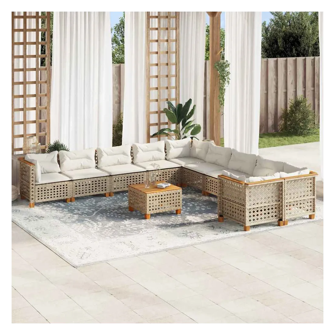 Cet ensemble de canapés de jardin est le complément parfait de votre arrière-cour, terrasse ou patio, offrant un espace confortable et accueillant pour discuter avec la famille et les amis ou simplement se détendre et profiter de l'extérieur. Matériau durable : la résine tressée, également connue sous le nom de poly rotin, est un matériau synthétique solide et nécessitant peu d'entretien qui ressemble au rotin naturel. Elle est légère, facile à nettoyer et couramment utilisée pour les meubles d'extérieur en raison de sa durabilité et de ses propriétés de résistance aux intempéries.Expérience d'assise confortable : ce mobilier d'extérieur, doté de coussins épais, offre une expérience d'assise confortable.Housse amovible et lavable : ces coussins de siège sont dotés de housses amovibles pour un lavage et un entretien faciles.Dessus stable et facile à nettoyer : cette table de jardin a un dessus en bois d'acacia robuste, durable et facile à nettoyer avec un chiffon humide.Conception modulaire : cet ensemble de meubles d'extérieur a une conception modulaire, ce qui le rend complètement flexible et facile à déplacer, afin que vous puissiez créer un agencement de meubles d'extérieur personnalisé. Bon à savoir :Pour que vos meubles d'extérieur restent beaux, nous vous recommandons de les protéger avec une housse imperméable.