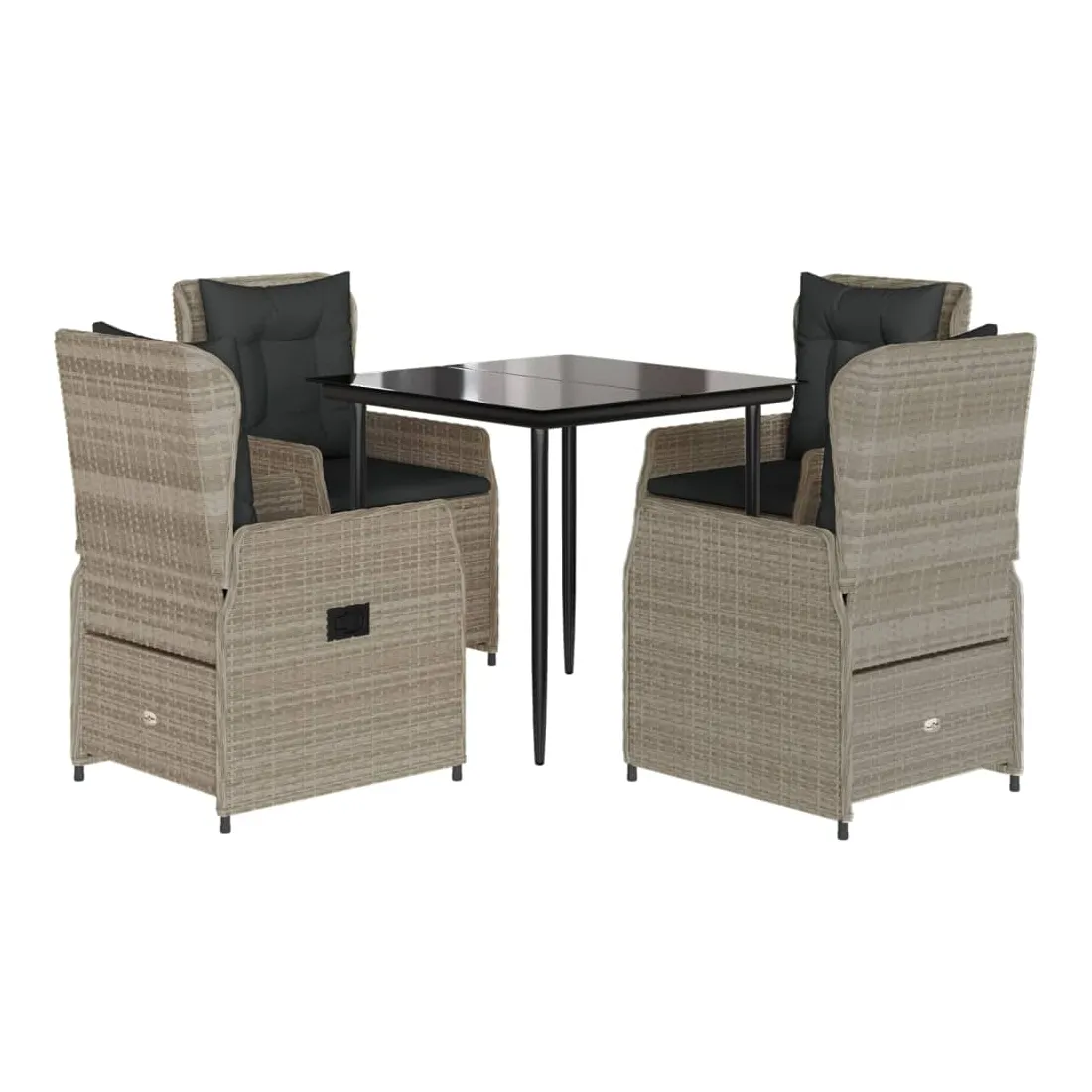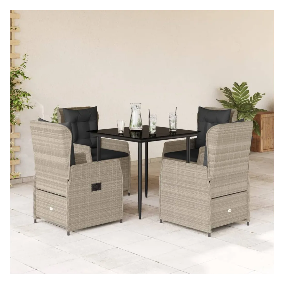 Cet ensemble de salle à manger de jardin est un excellent choix pour les repas en plein air ou pour vous détendre dans le jardin, dans l'arrière-cour ou sur la terrasse. Matériau durable : la résine tressée, également connue sous le nom de poly rotin, est un matériau synthétique solide et nécessitant peu d'entretien qui ressemble au rotin naturel. Il est léger, facile à nettoyer et couramment utilisé pour les meubles d'extérieur en raison de sa durabilité et de ses propriétés de résistance aux intempéries.Dossier réglable : ce siège de jardin est doté d'une poignée. Vous pouvez régler le dossier dans n'importe quelle position en tirant sur la poignée et le remettre rapidement dans sa position initiale.Expérience d'assise confortable : ce mobilier d'extérieur, doté de coussins épais, offre une expérience d'assise confortable.Housse amovible et lavable : le coussin de siège est doté d'une housse amovible pour un lavage et un entretien faciles.Dessus en verre : le dessus de la table d'extérieur est fabriqué en verre trempé solide et durable, ce qui le rend facile à nettoyer avec un chiffon humide et ajoute une touche d'élégance à votre espace extérieur. Bon à savoir :Pour que vos meubles d'extérieur restent beaux, nous vous recommandons de les protéger avec une housse imperméable.
