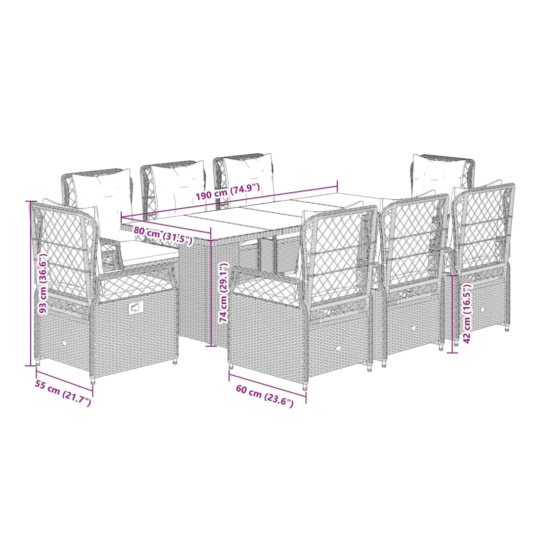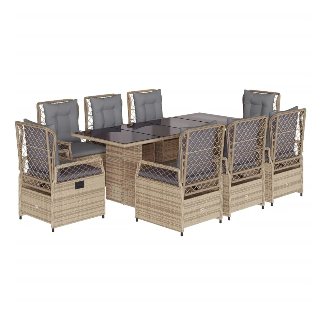 Cet ensemble de salle à manger de jardin est un excellent choix pour les repas en plein air ou pour vous détendre dans le jardin, dans l'arrière-cour ou sur la terrasse. Matériau durable : la résine tressée, également connue sous le nom de poly rotin, est un matériau synthétique solide et nécessitant peu d'entretien qui ressemble au rotin naturel. Il est léger, facile à nettoyer et couramment utilisé pour les meubles d'extérieur en raison de sa durabilité et de ses propriétés de résistance aux intempéries.Dossier réglable : ce siège de jardin est doté d'une poignée. Vous pouvez régler le dossier dans n'importe quelle position en tirant sur la poignée et le remettre rapidement dans sa position initiale.Expérience d'assise confortable : ce mobilier d'extérieur, doté de coussins épais, offre une expérience d'assise confortable.Housse amovible et lavable : le coussin de siège est doté d'une housse amovible pour un lavage et un entretien faciles.Dessus en verre : le dessus de la table d'extérieur est fabriqué en verre trempé solide et durable, ce qui le rend facile à nettoyer avec un chiffon humide et ajoute une touche d'élégance à votre espace extérieur. Bon à savoir :Pour que vos meubles d'extérieur restent beaux, nous vous recommandons de les protéger avec une housse imperméable.
