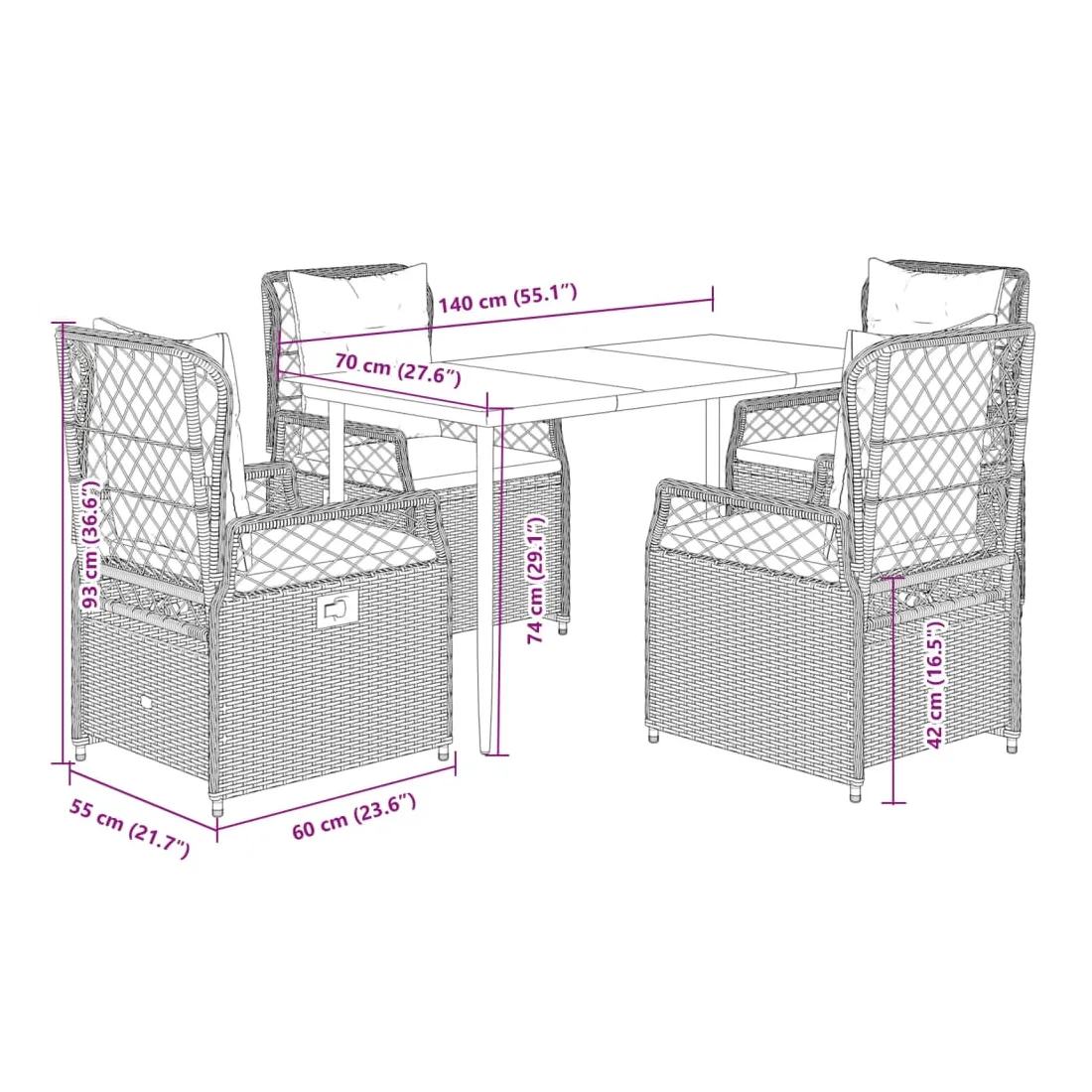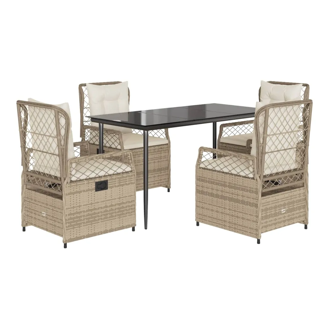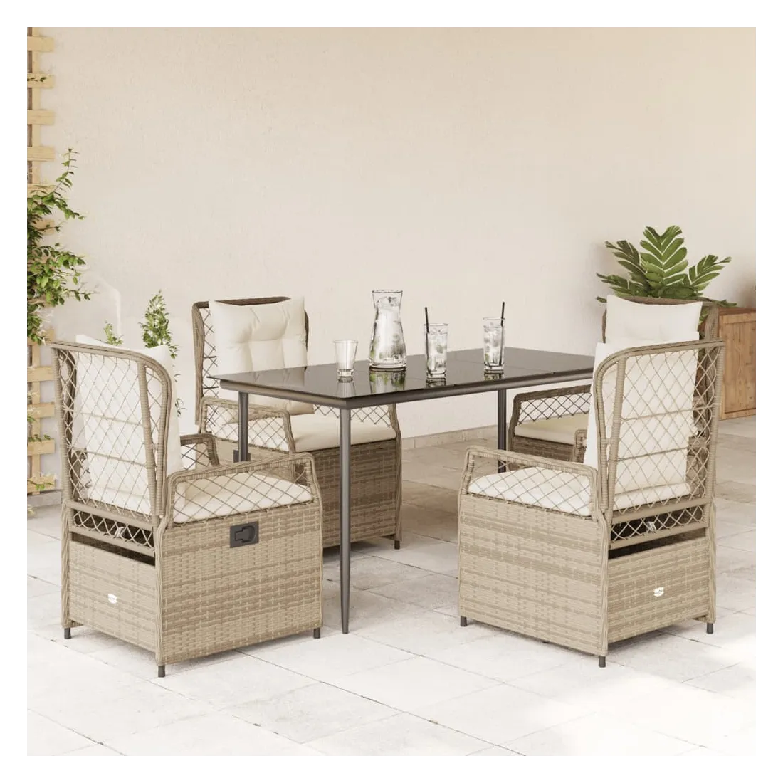 Cet ensemble de salle à manger de jardin est un excellent choix pour les repas en plein air ou pour vous détendre dans le jardin, dans l'arrière-cour ou sur la terrasse. Matériau durable : la résine tressée, également connue sous le nom de poly rotin, est un matériau synthétique solide et nécessitant peu d'entretien qui ressemble au rotin naturel. Il est léger, facile à nettoyer et couramment utilisé pour les meubles d'extérieur en raison de sa durabilité et de ses propriétés de résistance aux intempéries.Dossier réglable : ce siège de jardin est doté d'une poignée. Vous pouvez régler le dossier dans n'importe quelle position en tirant sur la poignée et le remettre rapidement dans sa position initiale.Expérience d'assise confortable : ce mobilier d'extérieur, doté de coussins épais, offre une expérience d'assise confortable.Housse amovible et lavable : le coussin de siège est doté d'une housse amovible pour un lavage et un entretien faciles.Dessus en verre : le dessus de la table d'extérieur est fabriqué en verre trempé solide et durable, ce qui le rend facile à nettoyer avec un chiffon humide et ajoute une touche d'élégance à votre espace extérieur. Bon à savoir :Pour que vos meubles d'extérieur restent beaux, nous vous recommandons de les protéger avec une housse imperméable.