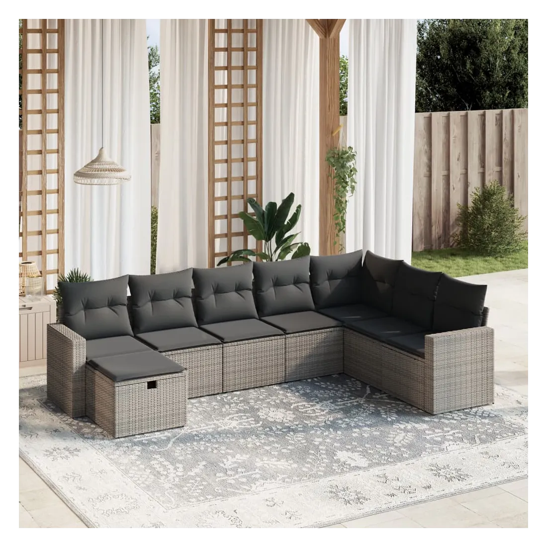 Cet ensemble de canapés de jardin est le complément parfait de votre arrière-cour, terrasse ou patio, offrant un espace confortable et accueillant pour discuter avec la famille et les amis ou simplement se détendre et profiter de l'extérieur. Matériau durable : la résine tressée, également connue sous le nom de poly rotin, est un matériau synthétique solide et nécessitant peu d'entretien qui ressemble au rotin naturel. Il est léger, facile à nettoyer et couramment utilisé pour les meubles d'extérieur en raison de sa durabilité et de ses propriétés de résistance aux intempéries.Expérience d'assise confortable : ce mobilier d'extérieur, doté de coussins épais, offre une expérience d'assise confortable.Housse amovible et lavable : ces coussins de siège sont dotés de housses amovibles pour un lavage et un entretien faciles.Cadre robuste et stable : le cadre en acier enduit de poudre assure la solidité et la stabilité du meuble de jardin pour une utilisation quotidienne à l'extérieur.Conception modulaire : cet ensemble de meubles d'extérieur a une conception modulaire, ce qui le rend complètement flexible et facile à déplacer, afin que vous puissiez créer un agencement de meubles d'extérieur personnalisé. Bon à savoir :Pour que vos meubles d'extérieur restent beaux, nous vous recommandons de les protéger avec une housse imperméable.
