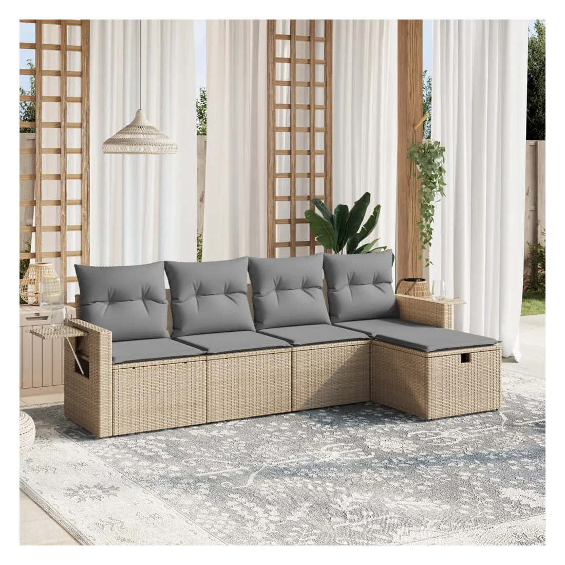 Cet ensemble de canapés de jardin est le complément parfait de votre arrière-cour, terrasse ou patio, offrant un espace confortable et accueillant pour discuter avec la famille et les amis ou simplement se détendre et profiter de l'extérieur. Matériau durable : la résine tressée, également connue sous le nom de poly rotin, est un matériau synthétique solide et nécessitant peu d'entretien qui ressemble au rotin naturel. Il est léger, facile à nettoyer et couramment utilisé pour les meubles d'extérieur en raison de sa durabilité et de ses propriétés de résistance aux intempéries.Expérience d'assise confortable : ce mobilier d'extérieur, doté de coussins épais, offre une expérience d'assise confortable.Housse amovible et lavable : ces coussins de siège sont dotés de housses amovibles pour un lavage et un entretien faciles.Cadre robuste et stable : le cadre en acier enduit de poudre assure la solidité et la stabilité du meuble de jardin pour une utilisation quotidienne à l'extérieur.Conception modulaire : cet ensemble de meubles d'extérieur a une conception modulaire, ce qui le rend complètement flexible et facile à déplacer, afin que vous puissiez créer un agencement de meubles d'extérieur personnalisé. Bon à savoir :Pour que vos meubles d'extérieur restent beaux, nous vous recommandons de les protéger avec une housse imperméable.