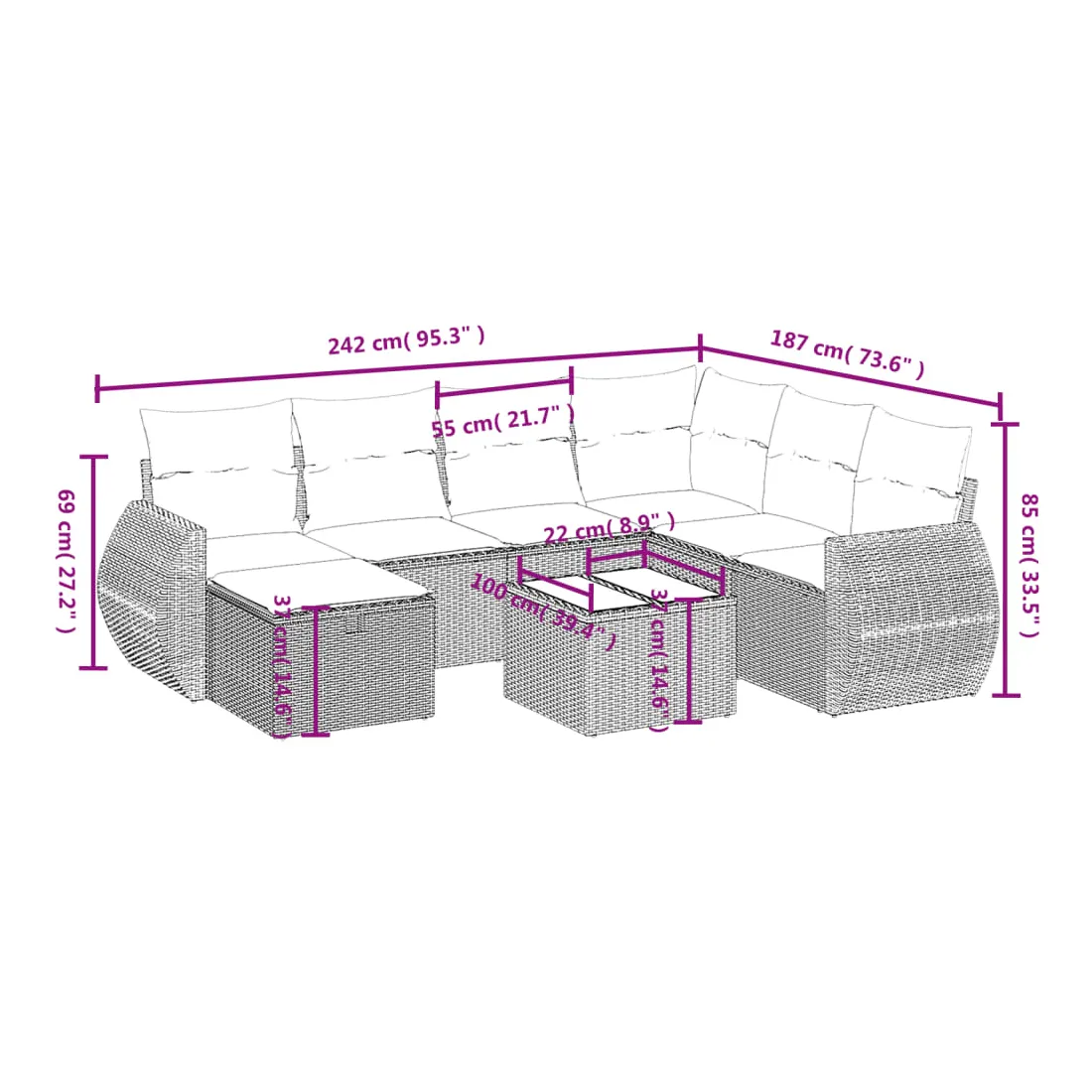 Cet ensemble de canapés de jardin est le complément parfait de votre arrière-cour, terrasse ou patio, offrant un espace confortable et accueillant pour discuter avec la famille et les amis ou simplement se détendre et profiter de l'extérieur. Matériau durable : la résine tressée, également connue sous le nom de poly rotin, est un matériau synthétique solide et nécessitant peu d'entretien qui ressemble au rotin naturel. Il est léger, facile à nettoyer et couramment utilisé pour les meubles d'extérieur en raison de sa durabilité et de ses propriétés de résistance aux intempéries.Dessus en verre : le dessus de la table d'extérieur est fabriqué en verre trempé solide et durable, ce qui le rend facile à nettoyer avec un chiffon humide et ajoute une touche d'élégance à votre espace extérieur.Housse amovible et lavable : ces coussins de siège sont dotés de housses amovibles pour un lavage et un entretien faciles.Cadre robuste et stable : le cadre en acier enduit de poudre assure la solidité et la stabilité du meuble de jardin pour une utilisation quotidienne à l'extérieur.Conception modulaire : cet ensemble de meubles d'extérieur a une conception modulaire, ce qui le rend complètement flexible et facile à déplacer, afin que vous puissiez créer un agencement de meubles d'extérieur personnalisé. Bon à savoir :Pour que vos meubles d'extérieur restent beaux, nous vous recommandons de les protéger avec une housse imperméable.