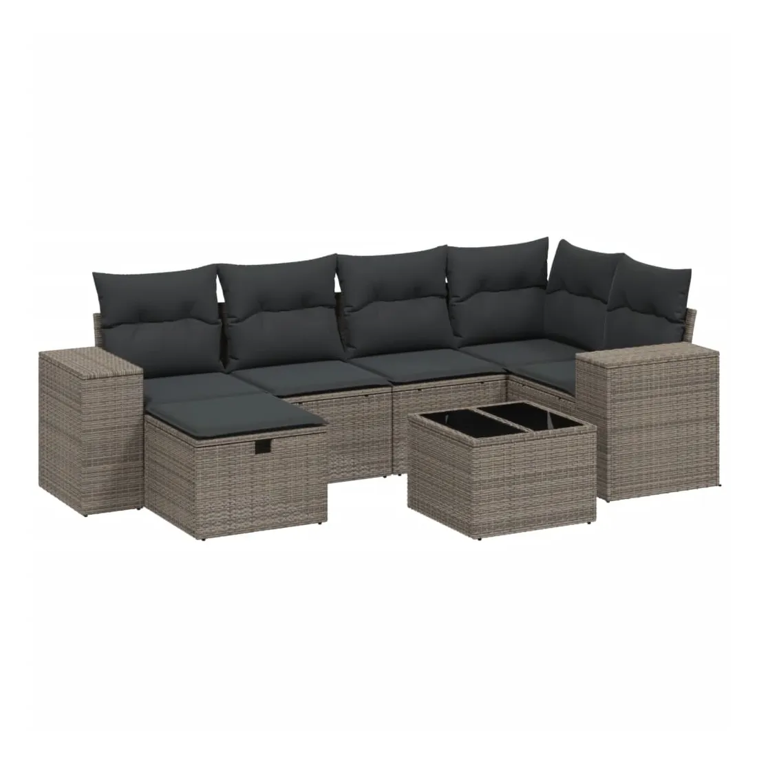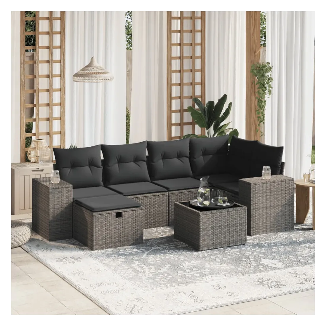 Cet ensemble de canapés de jardin est le complément parfait de votre arrière-cour, terrasse ou patio, offrant un espace confortable et accueillant pour discuter avec la famille et les amis ou simplement se détendre et profiter de l'extérieur. Matériau durable : la résine tressée, également connue sous le nom de poly rotin, est un matériau synthétique solide et nécessitant peu d'entretien qui ressemble au rotin naturel. Il est léger, facile à nettoyer et couramment utilisé pour les meubles d'extérieur en raison de sa durabilité et de ses propriétés de résistance aux intempéries.Dessus en verre : le dessus de la table d'extérieur est fabriqué en verre trempé solide et durable, ce qui le rend facile à nettoyer avec un chiffon humide et ajoute une touche d'élégance à votre espace extérieur.Housse amovible et lavable : ces coussins de siège sont dotés de housses amovibles pour un lavage et un entretien faciles.Cadre robuste et stable : le cadre en acier enduit de poudre assure la solidité et la stabilité du meuble de jardin pour une utilisation quotidienne à l'extérieur.Conception modulaire : cet ensemble de meubles d'extérieur a une conception modulaire, ce qui le rend complètement flexible et facile à déplacer, afin que vous puissiez créer un agencement de meubles d'extérieur personnalisé. Bon à savoir :Pour que vos meubles d'extérieur restent beaux, nous vous recommandons de les protéger avec une housse imperméable.