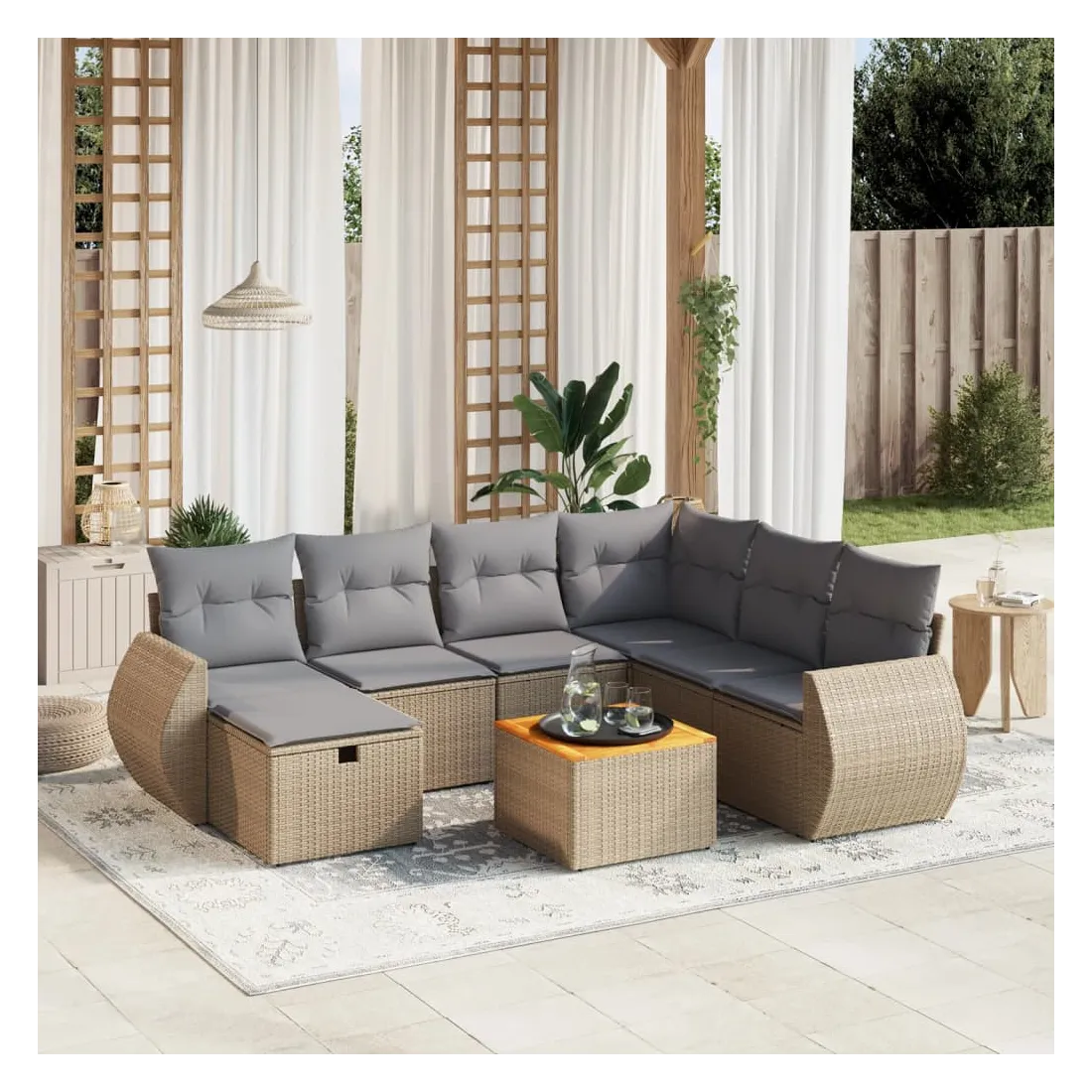 Cet ensemble de canapés de jardin est le complément parfait de votre arrière-cour, terrasse ou patio, offrant un espace confortable et accueillant pour discuter avec la famille et les amis ou simplement se détendre et profiter de l'extérieur. Matériau durable : la résine tressée, également connue sous le nom de poly rotin, est un matériau synthétique solide et nécessitant peu d'entretien qui ressemble au rotin naturel. Il est léger, facile à nettoyer et couramment utilisé pour les meubles d'extérieur en raison de sa durabilité et de ses propriétés de résistance aux intempéries.Dessus stable et facile à nettoyer : cette table de jardin a un dessus en bois d'acacia robuste, durable et facile à nettoyer avec un chiffon humide.Housse amovible et lavable : ces coussins de siège sont dotés de housses amovibles pour un lavage et un entretien faciles.Cadre robuste et stable : le cadre en acier enduit de poudre assure la solidité et la stabilité du meuble de jardin pour une utilisation quotidienne à l'extérieur.Conception modulaire : cet ensemble de meubles d'extérieur a une conception modulaire, ce qui le rend complètement flexible et facile à déplacer, afin que vous puissiez créer un agencement de meubles d'extérieur personnalisé. Bon à savoir :Pour que vos meubles d'extérieur restent beaux, nous vous recommandons de les protéger avec une housse imperméable.