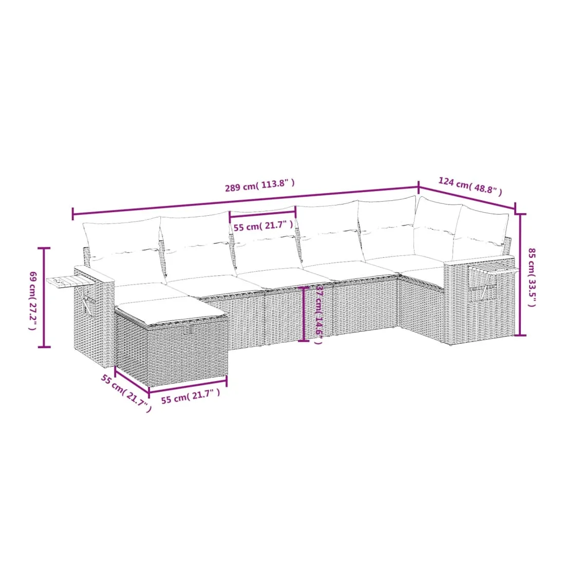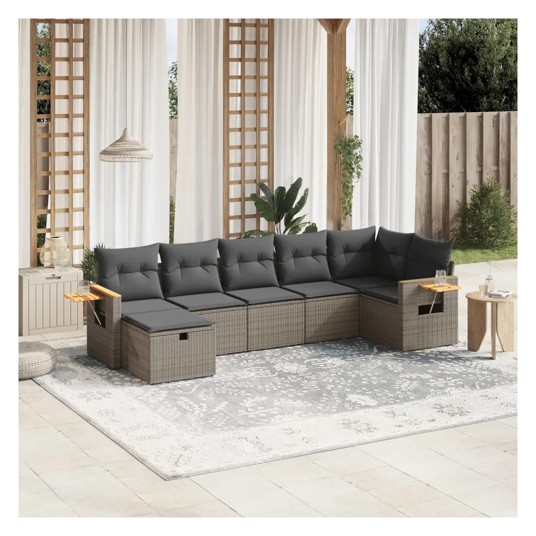 Cet ensemble de canapés de jardin est le complément parfait de votre arrière-cour, terrasse ou patio, offrant un espace confortable et accueillant pour discuter avec la famille et les amis ou simplement se détendre et profiter de l'extérieur. Matériau durable : la résine tressée, également connue sous le nom de poly rotin, est un matériau synthétique solide et nécessitant peu d'entretien qui ressemble au rotin naturel. Il est léger, facile à nettoyer et couramment utilisé pour les meubles d'extérieur en raison de sa durabilité et de ses propriétés de résistance aux intempéries.Expérience d'assise confortable : ce mobilier d'extérieur, doté de coussins épais, offre une expérience d'assise confortable.Housse amovible et lavable : ces coussins de siège sont dotés de housses amovibles pour un lavage et un entretien faciles.Cadre robuste et stable : le cadre en acier enduit de poudre assure la solidité et la stabilité du meuble de jardin pour une utilisation quotidienne à l'extérieur.Conception modulaire : cet ensemble de meubles d'extérieur a une conception modulaire, ce qui le rend complètement flexible et facile à déplacer, afin que vous puissiez créer un agencement de meubles d'extérieur personnalisé. Bon à savoir :Pour que vos meubles d'extérieur restent beaux, nous vous recommandons de les protéger avec une housse imperméable.