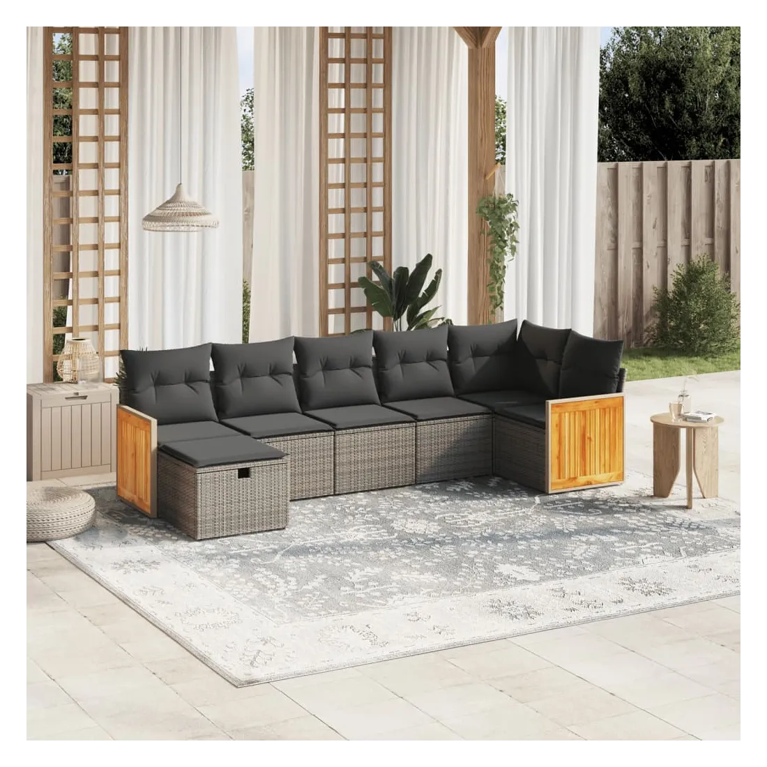 Cet ensemble de canapés de jardin est le complément parfait de votre arrière-cour, terrasse ou patio, offrant un espace confortable et accueillant pour discuter avec la famille et les amis ou simplement se détendre et profiter de l'extérieur. Matériau durable : la résine tressée, également connue sous le nom de poly rotin, est un matériau synthétique solide et nécessitant peu d'entretien qui ressemble au rotin naturel. Il est léger, facile à nettoyer et couramment utilisé pour les meubles d'extérieur en raison de sa durabilité et de ses propriétés de résistance aux intempéries.Expérience d'assise confortable : ce mobilier d'extérieur, doté de coussins épais, offre une expérience d'assise confortable.Housse amovible et lavable : ces coussins de siège sont dotés de housses amovibles pour un lavage et un entretien faciles.Cadre robuste et stable : le cadre en acier enduit de poudre assure la solidité et la stabilité du meuble de jardin pour une utilisation quotidienne à l'extérieur.Conception modulaire : cet ensemble de meubles d'extérieur a une conception modulaire, ce qui le rend complètement flexible et facile à déplacer, afin que vous puissiez créer un agencement de meubles d'extérieur personnalisé. Bon à savoir :Pour que vos meubles d'extérieur restent beaux, nous vous recommandons de les protéger avec une housse imperméable.