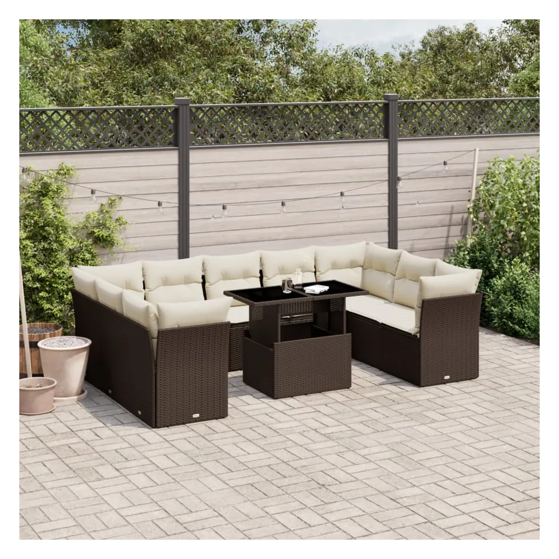 Cet ensemble de canapés de jardin est le complément parfait de votre arrière-cour, terrasse ou patio, offrant un espace confortable et accueillant pour discuter avec la famille et les amis ou simplement se détendre et profiter de l'extérieur. Matériau durable : la résine tressée, également connue sous le nom de poly rotin, est un matériau synthétique solide et nécessitant peu d'entretien qui ressemble au rotin naturel. Il est léger, facile à nettoyer et couramment utilisé pour les meubles d'extérieur en raison de sa durabilité et de ses propriétés de résistance aux intempéries.Dessus de table réglable : le dessus de table peut être soulevé pour rendre la table plus haute, ce qui transforme la table d'extérieur d'une table basse à une table de salle à manger. Elle est parfaite pour recevoir des invités ou prendre des repas à l'extérieur.Expérience d'assise confortable : ce mobilier d'extérieur, doté de coussins épais, offre une expérience d'assise confortable.Housse amovible et lavable : ces coussins de siège sont dotés de housses amovibles pour un lavage et un entretien faciles.Conception modulaire : cet ensemble de meubles d'extérieur a une conception modulaire, ce qui le rend complètement flexible et facile à déplacer, afin que vous puissiez créer un agencement de meubles d'extérieur personnalisé. Bon à savoir :Pour que vos meubles d'extérieur restent beaux, nous vous recommandons de les protéger avec une housse imperméable.