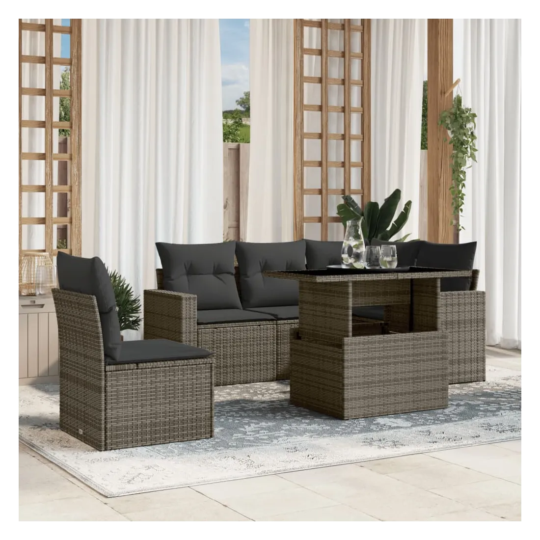 Cet ensemble de canapés de jardin est le complément parfait de votre arrière-cour, terrasse ou patio, offrant un espace confortable et accueillant pour discuter avec la famille et les amis ou simplement se détendre et profiter de l'extérieur. Matériau durable : la résine tressée, également connue sous le nom de poly rotin, est un matériau synthétique solide et nécessitant peu d'entretien qui ressemble au rotin naturel. Il est léger, facile à nettoyer et couramment utilisé pour les meubles d'extérieur en raison de sa durabilité et de ses propriétés de résistance aux intempéries.Dessus de table réglable : le dessus de table peut être soulevé pour rendre la table plus haute, ce qui transforme la table d'extérieur d'une table basse à une table de salle à manger. Elle est parfaite pour recevoir des invités ou prendre des repas à l'extérieur.Expérience d'assise confortable : ce mobilier d'extérieur, doté de coussins épais, offre une expérience d'assise confortable.Housse amovible et lavable : ces coussins de siège sont dotés de housses amovibles pour un lavage et un entretien faciles.Conception modulaire : cet ensemble de meubles d'extérieur a une conception modulaire, ce qui le rend complètement flexible et facile à déplacer, afin que vous puissiez créer un agencement de meubles d'extérieur personnalisé. Bon à savoir :Pour que vos meubles d'extérieur restent beaux, nous vous recommandons de les protéger avec une housse imperméable.