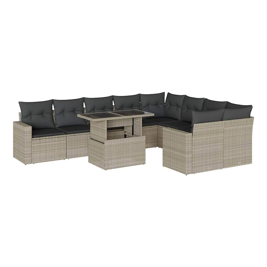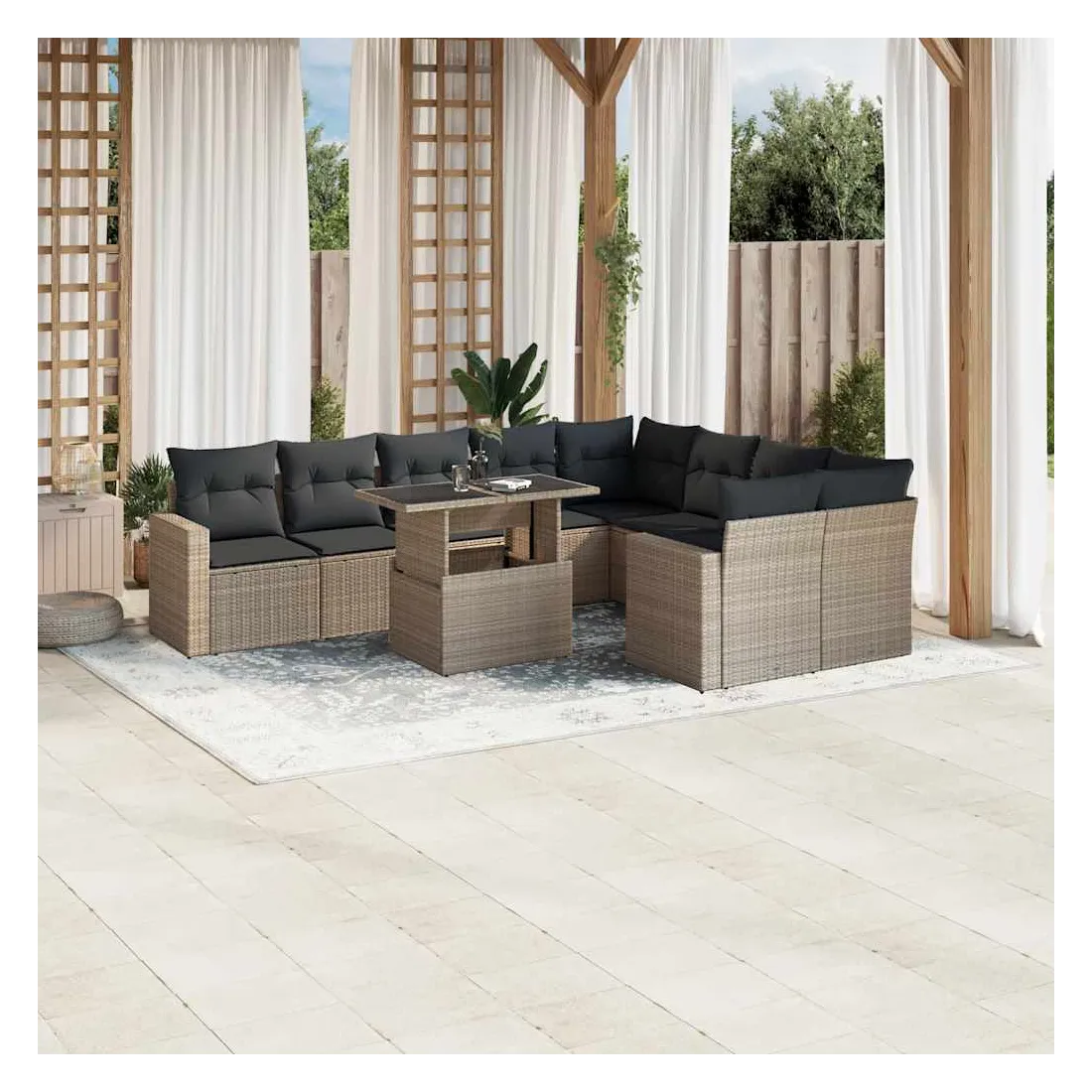Cet ensemble de canapés de jardin est le complément parfait de votre arrière-cour, terrasse ou patio, offrant un espace confortable et accueillant pour discuter avec la famille et les amis ou simplement se détendre et profiter de l'extérieur. Matériau durable : la résine tressée, également connue sous le nom de poly rotin, est un matériau synthétique solide et nécessitant peu d'entretien qui ressemble au rotin naturel. Elle est légère, facile à nettoyer et couramment utilisée pour les meubles d'extérieur en raison de sa durabilité et de ses propriétés de résistance aux intempéries.Dessus de table réglable : le dessus de table peut être soulevé pour rendre la table plus haute, ce qui transforme la table d'extérieur d'une table basse à une table de salle à manger. Elle est parfaite pour recevoir des invités ou prendre des repas à l'extérieur.Expérience d'assise confortable : ce mobilier d'extérieur, doté de coussins épais, offre une expérience d'assise confortable.Housse amovible et lavable : ces coussins de siège sont dotés de housses amovibles pour un lavage et un entretien faciles.Conception modulaire : cet ensemble de meubles d'extérieur a une conception modulaire, ce qui le rend complètement flexible et facile à déplacer, afin que vous puissiez créer un agencement de meubles d'extérieur personnalisé. Bon à savoir :Pour que vos meubles d'extérieur restent beaux, nous vous recommandons de les protéger avec une housse imperméable.