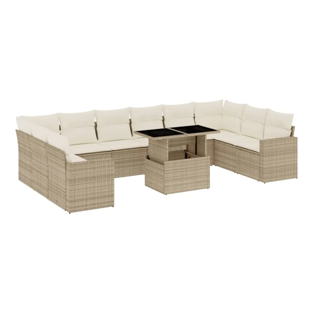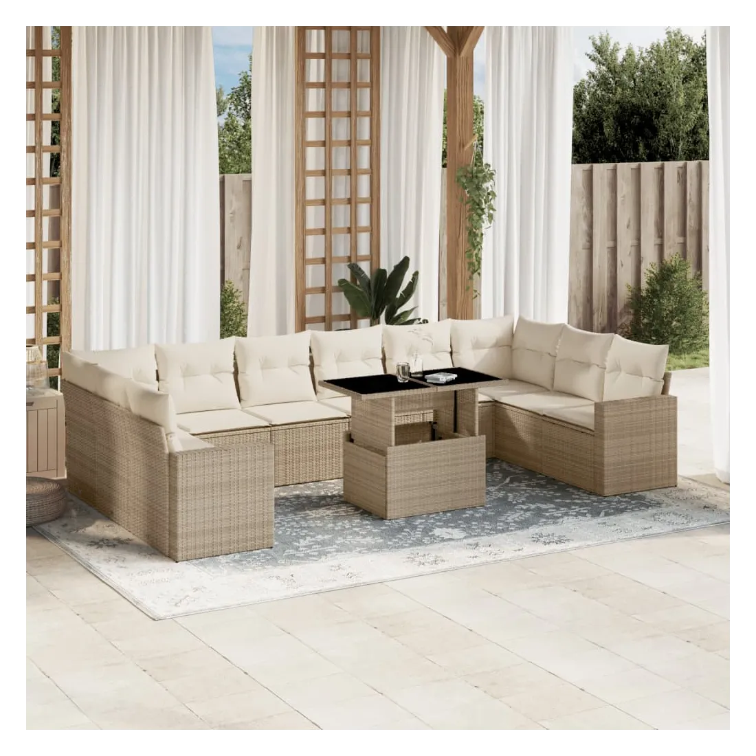 Cet ensemble de canapés de jardin est le complément parfait de votre arrière-cour, terrasse ou patio, offrant un espace confortable et accueillant pour discuter avec la famille et les amis ou simplement se détendre et profiter de l'extérieur. Matériau durable : la résine tressée, également connue sous le nom de poly rotin, est un matériau synthétique solide et nécessitant peu d'entretien qui ressemble au rotin naturel. Il est léger, facile à nettoyer et couramment utilisé pour les meubles d'extérieur en raison de sa durabilité et de ses propriétés de résistance aux intempéries.Dessus de table réglable : le dessus de table peut être soulevé pour rendre la table plus haute, ce qui transforme la table d'extérieur d'une table basse à une table de salle à manger. Elle est parfaite pour recevoir des invités ou prendre des repas à l'extérieur.Expérience d'assise confortable : ce mobilier d'extérieur, doté de coussins épais, offre une expérience d'assise confortable.Housse amovible et lavable : ces coussins de siège sont dotés de housses amovibles pour un lavage et un entretien faciles.Conception modulaire : cet ensemble de meubles d'extérieur a une conception modulaire, ce qui le rend complètement flexible et facile à déplacer, afin que vous puissiez créer un agencement de meubles d'extérieur personnalisé. Bon à savoir :Pour que vos meubles d'extérieur restent beaux, nous vous recommandons de les protéger avec une housse imperméable.