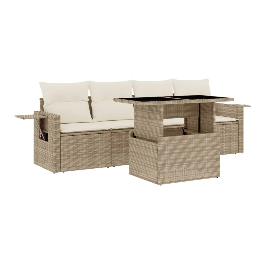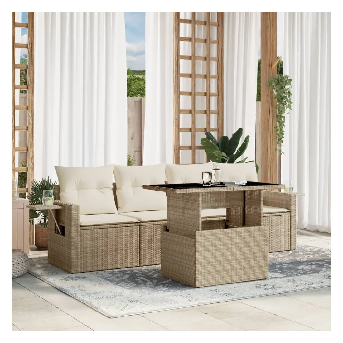 Cet ensemble de canapés de jardin est le complément parfait de votre arrière-cour, terrasse ou patio, offrant un espace confortable et accueillant pour discuter avec la famille et les amis ou simplement se détendre et profiter de l'extérieur. Matériau durable : la résine tressée, également connue sous le nom de poly rotin, est un matériau synthétique solide et nécessitant peu d'entretien qui ressemble au rotin naturel. Il est léger, facile à nettoyer et couramment utilisé pour les meubles d'extérieur en raison de sa durabilité et de ses propriétés de résistance aux intempéries.Dessus de table réglable : le dessus de table peut être soulevé pour rendre la table plus haute, ce qui transforme la table d'extérieur d'une table basse à une table de salle à manger. Elle est parfaite pour recevoir des invités ou prendre des repas à l'extérieur.Table d'appoint pratique : ce mobilier d'extérieur comprend des tables d'appoint pliables avec un ressort à gaz sur les accoudoirs, offrant des endroits pratiques pour garder vos essentiels à portée de main. Expérience d'assise confortable : ce mobilier d'extérieur, doté de coussins épais, offre une expérience d'assise confortable.Conception modulaire : cet ensemble de meubles d'extérieur a une conception modulaire, ce qui le rend complètement flexible et facile à déplacer, afin que vous puissiez créer un agencement de meubles d'extérieur personnalisé. Bon à savoir :Pour que vos meubles d'extérieur restent beaux, nous vous recommandons de les protéger avec une housse imperméable.