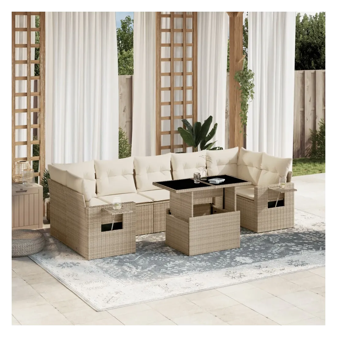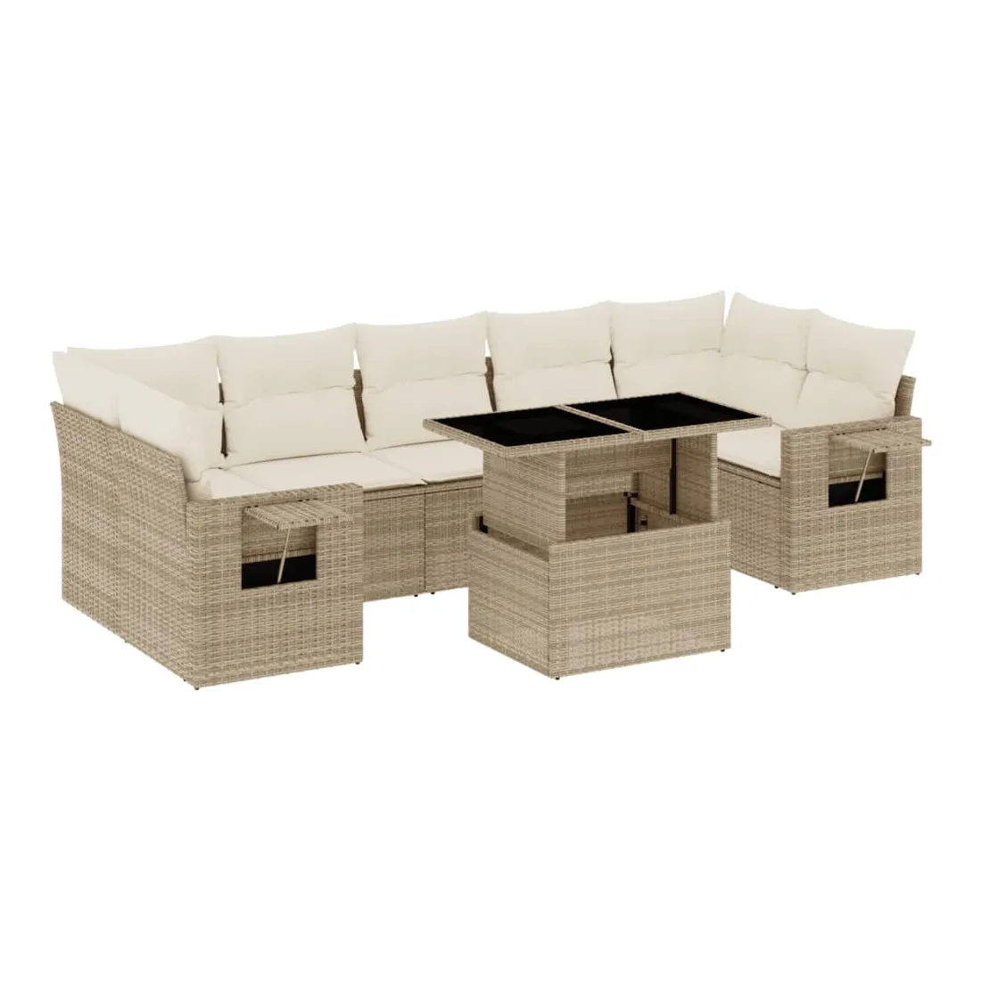 Cet ensemble de canapés de jardin est le complément parfait de votre arrière-cour, terrasse ou patio, offrant un espace confortable et accueillant pour discuter avec la famille et les amis ou simplement se détendre et profiter de l'extérieur. Matériau durable : la résine tressée, également connue sous le nom de poly rotin, est un matériau synthétique solide et nécessitant peu d'entretien qui ressemble au rotin naturel. Il est léger, facile à nettoyer et couramment utilisé pour les meubles d'extérieur en raison de sa durabilité et de ses propriétés de résistance aux intempéries.Dessus de table réglable : le dessus de table peut être soulevé pour rendre la table plus haute, ce qui transforme la table d'extérieur d'une table basse à une table de salle à manger. Elle est parfaite pour recevoir des invités ou prendre des repas à l'extérieur.Table d'appoint pratique : ce mobilier d'extérieur comprend des tables d'appoint pliables avec un ressort à gaz sur les accoudoirs, offrant des endroits pratiques pour garder vos essentiels à portée de main. Expérience d'assise confortable : ce mobilier d'extérieur, doté de coussins épais, offre une expérience d'assise confortable.Conception modulaire : cet ensemble de meubles d'extérieur a une conception modulaire, ce qui le rend complètement flexible et facile à déplacer, afin que vous puissiez créer un agencement de meubles d'extérieur personnalisé. Bon à savoir :Pour que vos meubles d'extérieur restent beaux, nous vous recommandons de les protéger avec une housse imperméable.
