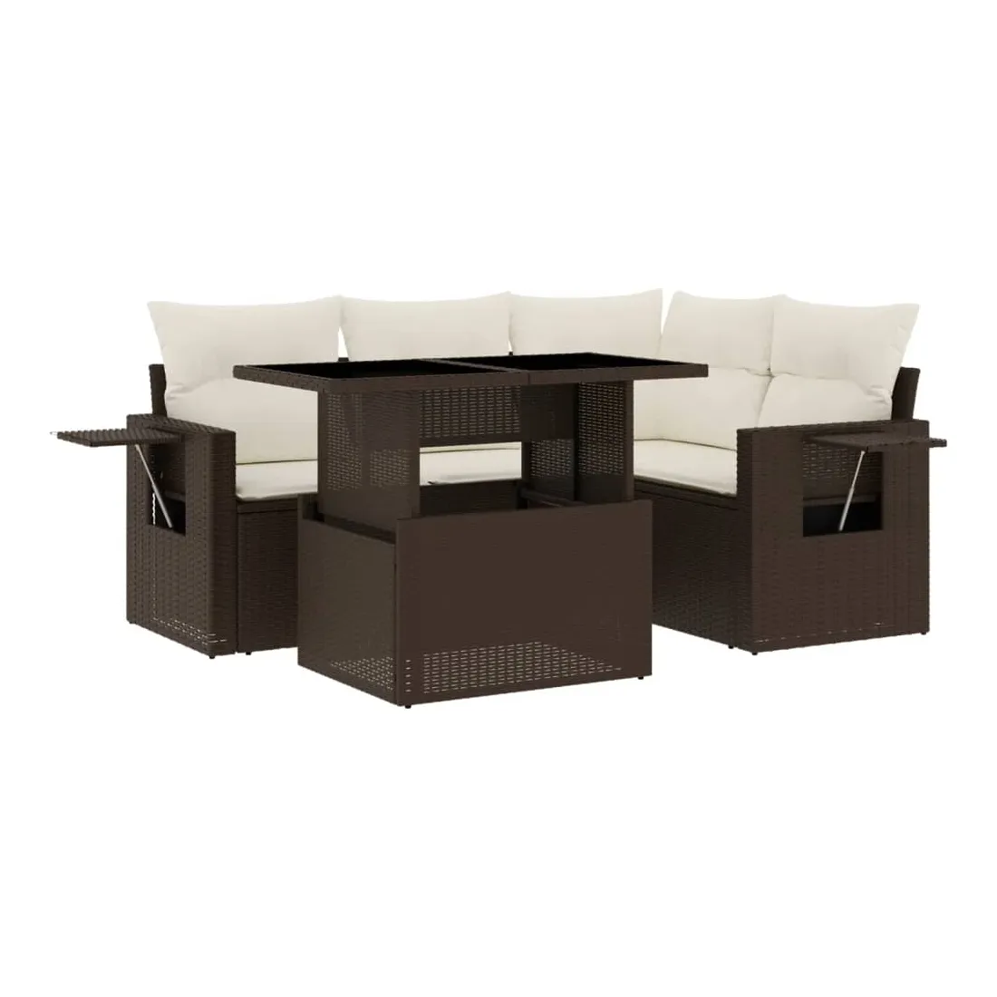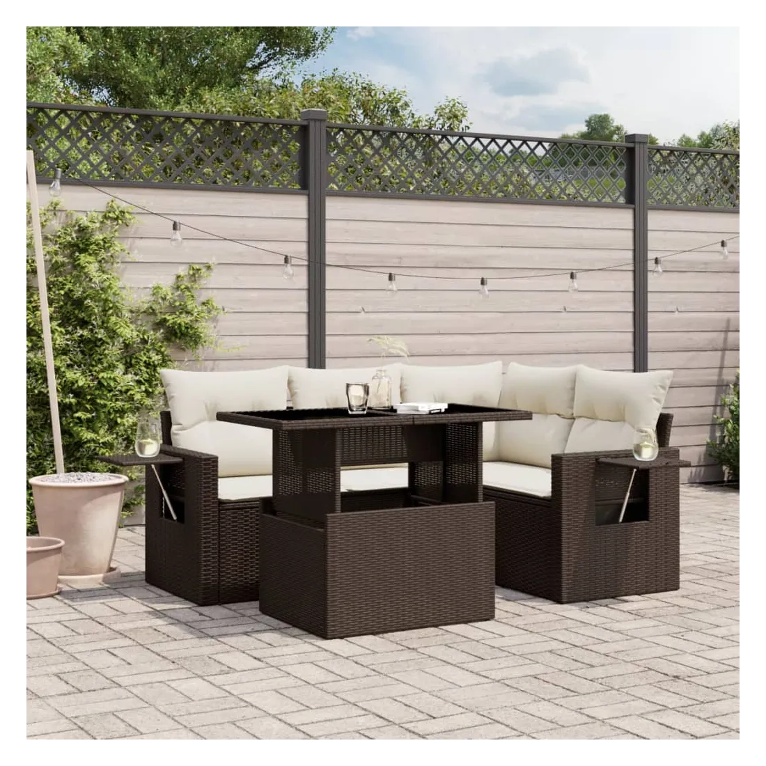 Cet ensemble de canapés de jardin est le complément parfait de votre arrière-cour, terrasse ou patio, offrant un espace confortable et accueillant pour discuter avec la famille et les amis ou simplement se détendre et profiter de l'extérieur. Matériau durable : la résine tressée, également connue sous le nom de poly rotin, est un matériau synthétique solide et nécessitant peu d'entretien qui ressemble au rotin naturel. Il est léger, facile à nettoyer et couramment utilisé pour les meubles d'extérieur en raison de sa durabilité et de ses propriétés de résistance aux intempéries.Dessus de table réglable : le dessus de table peut être soulevé pour rendre la table plus haute, ce qui transforme la table d'extérieur d'une table basse à une table de salle à manger. Elle est parfaite pour recevoir des invités ou prendre des repas à l'extérieur.Table d'appoint pratique : ce mobilier d'extérieur comprend des tables d'appoint pliables avec un ressort à gaz sur les accoudoirs, offrant des endroits pratiques pour garder vos essentiels à portée de main. Expérience d'assise confortable : ce mobilier d'extérieur, doté de coussins épais, offre une expérience d'assise confortable.Conception modulaire : cet ensemble de meubles d'extérieur a une conception modulaire, ce qui le rend complètement flexible et facile à déplacer, afin que vous puissiez créer un agencement de meubles d'extérieur personnalisé. Bon à savoir :Pour que vos meubles d'extérieur restent beaux, nous vous recommandons de les protéger avec une housse imperméable.