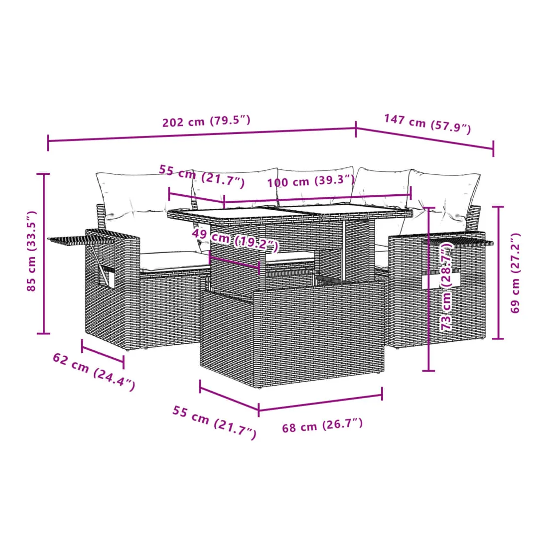 - Dimensions : 61,5/85 x 62 x 69 cm (l x P x H)