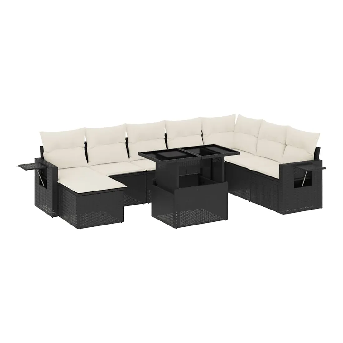 Cet ensemble de canapés de jardin est le complément parfait de votre arrière-cour, terrasse ou patio, offrant un espace confortable et accueillant pour discuter avec la famille et les amis ou simplement se détendre et profiter de l'extérieur. Matériau durable : la résine tressée, également connue sous le nom de poly rotin, est un matériau synthétique solide et nécessitant peu d'entretien qui ressemble au rotin naturel. Il est léger, facile à nettoyer et couramment utilisé pour les meubles d'extérieur en raison de sa durabilité et de ses propriétés de résistance aux intempéries.Dessus de table réglable : le dessus de table peut être soulevé pour rendre la table plus haute, ce qui transforme la table d'extérieur d'une table basse à une table de salle à manger. Elle est parfaite pour recevoir des invités ou prendre des repas à l'extérieur.Table d'appoint pratique : ce mobilier d'extérieur comprend des tables d'appoint pliables avec un ressort à gaz sur les accoudoirs, offrant des endroits pratiques pour garder vos essentiels à portée de main. Expérience d'assise confortable : ce mobilier d'extérieur, doté de coussins épais, offre une expérience d'assise confortable.Conception modulaire : cet ensemble de meubles d'extérieur a une conception modulaire, ce qui le rend complètement flexible et facile à déplacer, afin que vous puissiez créer un agencement de meubles d'extérieur personnalisé. Bon à savoir :Pour que vos meubles d'extérieur restent beaux, nous vous recommandons de les protéger avec une housse imperméable.