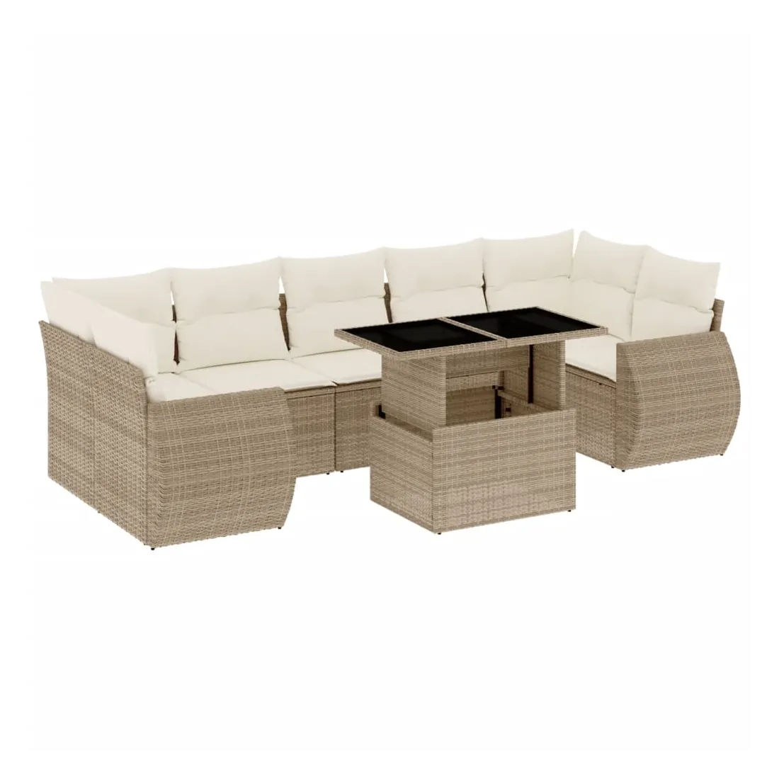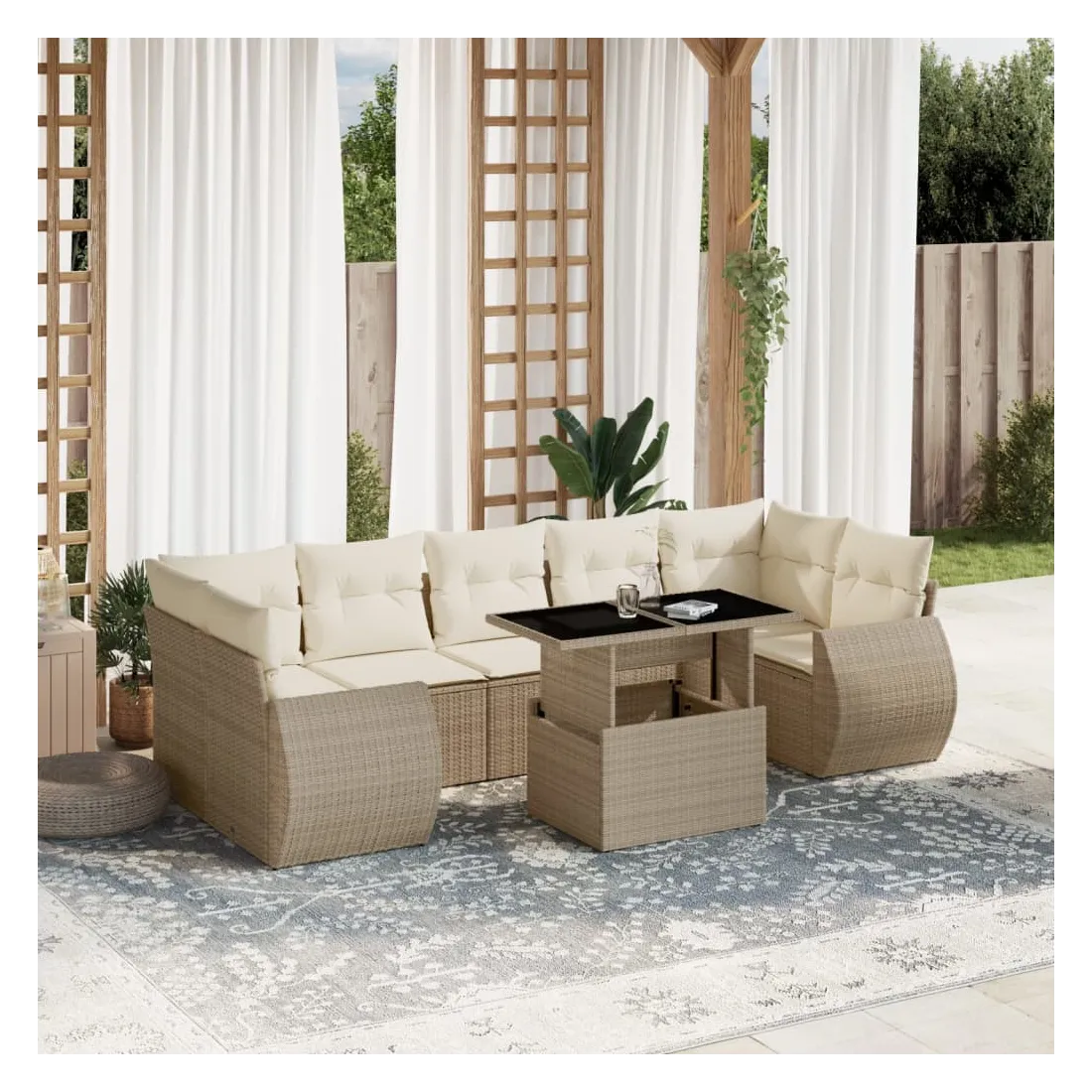 Cet ensemble de canapés de jardin est le complément parfait de votre arrière-cour, terrasse ou patio, offrant un espace confortable et accueillant pour discuter avec la famille et les amis ou simplement se détendre et profiter de l'extérieur. Matériau durable : la résine tressée, également connue sous le nom de poly rotin, est un matériau synthétique solide et nécessitant peu d'entretien qui ressemble au rotin naturel. Il est léger, facile à nettoyer et couramment utilisé pour les meubles d'extérieur en raison de sa durabilité et de ses propriétés de résistance aux intempéries.Dessus de table réglable : le dessus de table peut être soulevé pour rendre la table plus haute, ce qui transforme la table d'extérieur d'une table basse à une table de salle à manger. Elle est parfaite pour recevoir des invités ou prendre des repas à l'extérieur.Expérience d'assise confortable : ce mobilier d'extérieur, doté de coussins épais, offre une expérience d'assise confortable.Housse amovible et lavable : ces coussins de siège sont dotés de housses amovibles pour un lavage et un entretien faciles.Conception modulaire : cet ensemble de meubles d'extérieur a une conception modulaire, ce qui le rend complètement flexible et facile à déplacer, afin que vous puissiez créer un agencement de meubles d'extérieur personnalisé. Bon à savoir :Pour que vos meubles d'extérieur restent beaux, nous vous recommandons de les protéger avec une housse imperméable.
