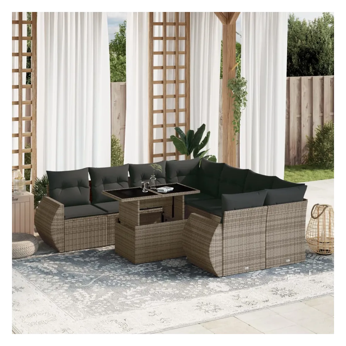Cet ensemble de canapés de jardin est le complément parfait de votre arrière-cour, terrasse ou patio, offrant un espace confortable et accueillant pour discuter avec la famille et les amis ou simplement se détendre et profiter de l'extérieur. Matériau durable : la résine tressée, également connue sous le nom de poly rotin, est un matériau synthétique solide et nécessitant peu d'entretien qui ressemble au rotin naturel. Il est léger, facile à nettoyer et couramment utilisé pour les meubles d'extérieur en raison de sa durabilité et de ses propriétés de résistance aux intempéries.Dessus de table réglable : le dessus de table peut être soulevé pour rendre la table plus haute, ce qui transforme la table d'extérieur d'une table basse à une table de salle à manger. Elle est parfaite pour recevoir des invités ou prendre des repas à l'extérieur.Expérience d'assise confortable : ce mobilier d'extérieur, doté de coussins épais, offre une expérience d'assise confortable.Housse amovible et lavable : ces coussins de siège sont dotés de housses amovibles pour un lavage et un entretien faciles.Conception modulaire : cet ensemble de meubles d'extérieur a une conception modulaire, ce qui le rend complètement flexible et facile à déplacer, afin que vous puissiez créer un agencement de meubles d'extérieur personnalisé. Bon à savoir :Pour que vos meubles d'extérieur restent beaux, nous vous recommandons de les protéger avec une housse imperméable.