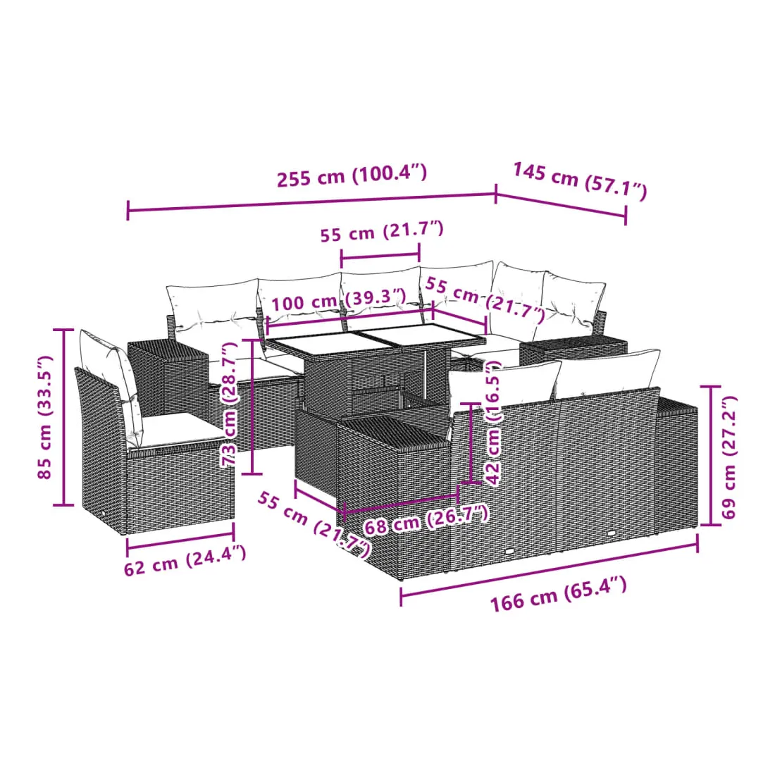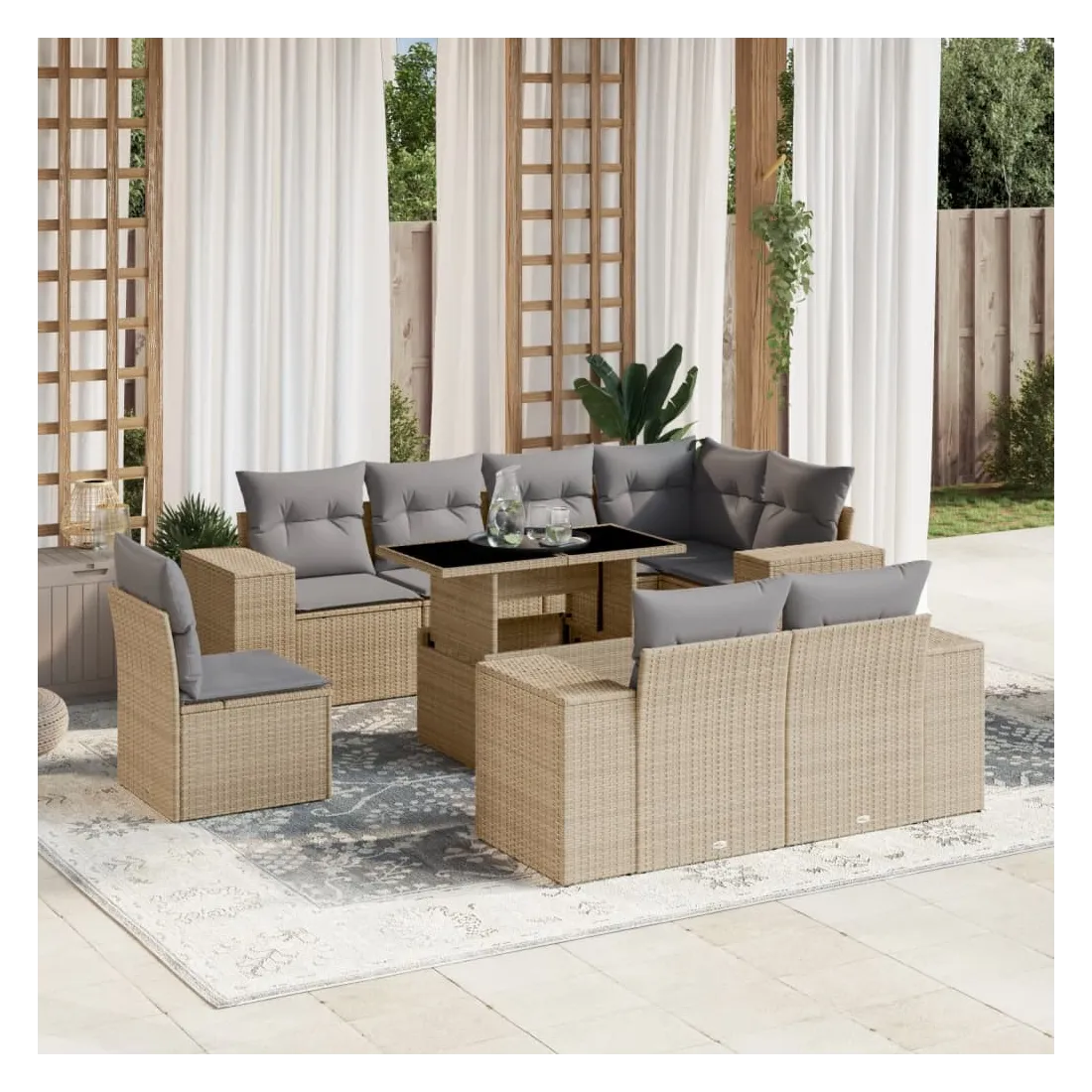Cet ensemble de canapés de jardin est le complément parfait de votre arrière-cour, terrasse ou patio, offrant un espace confortable et accueillant pour discuter avec la famille et les amis ou simplement se détendre et profiter de l'extérieur. Matériau durable : la résine tressée, également connue sous le nom de poly rotin, est un matériau synthétique solide et nécessitant peu d'entretien qui ressemble au rotin naturel. Il est léger, facile à nettoyer et couramment utilisé pour les meubles d'extérieur en raison de sa durabilité et de ses propriétés de résistance aux intempéries.Dessus de table réglable : le dessus de table peut être soulevé pour rendre la table plus haute, ce qui transforme la table d'extérieur d'une table basse à une table de salle à manger. Elle est parfaite pour recevoir des invités ou prendre des repas à l'extérieur.Expérience d'assise confortable : ce mobilier d'extérieur, doté de coussins épais, offre une expérience d'assise confortable.Housse amovible et lavable : ces coussins de siège sont dotés de housses amovibles pour un lavage et un entretien faciles.Conception modulaire : cet ensemble de meubles d'extérieur a une conception modulaire, ce qui le rend complètement flexible et facile à déplacer, afin que vous puissiez créer un agencement de meubles d'extérieur personnalisé. Bon à savoir :Pour que vos meubles d'extérieur restent beaux, nous vous recommandons de les protéger avec une housse imperméable.