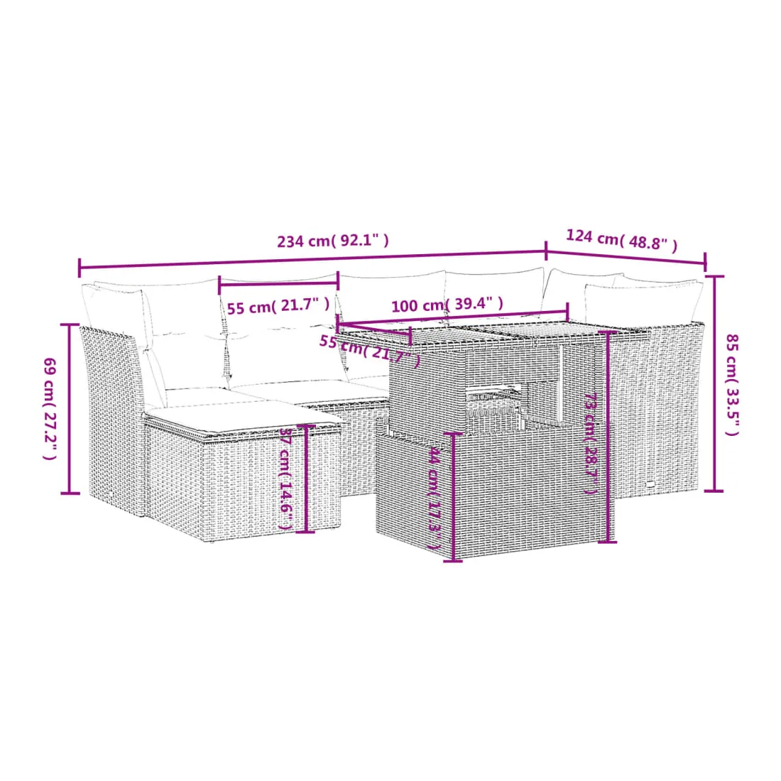 Cet ensemble de canapés de jardin est le complément parfait de votre arrière-cour, terrasse ou patio, offrant un espace confortable et accueillant pour discuter avec la famille et les amis ou simplement se détendre et profiter de l'extérieur. Matériau durable : la résine tressée, également connue sous le nom de poly rotin, est un matériau synthétique solide et nécessitant peu d'entretien qui ressemble au rotin naturel. Il est léger, facile à nettoyer et couramment utilisé pour les meubles d'extérieur en raison de sa durabilité et de ses propriétés de résistance aux intempéries.Dessus de table réglable : le dessus de table peut être soulevé pour rendre la table plus haute, ce qui transforme la table d'extérieur d'une table basse à une table de salle à manger. Elle est parfaite pour recevoir des invités ou prendre des repas à l'extérieur.Expérience d'assise confortable : ce mobilier d'extérieur, doté de coussins épais, offre une expérience d'assise confortable.Housse amovible et lavable : ces coussins de siège sont dotés de housses amovibles pour un lavage et un entretien faciles.Conception modulaire : cet ensemble de meubles d'extérieur a une conception modulaire, ce qui le rend complètement flexible et facile à déplacer, afin que vous puissiez créer un agencement de meubles d'extérieur personnalisé. Bon à savoir :Pour que vos meubles d'extérieur restent beaux, nous vous recommandons de les protéger avec une housse imperméable.