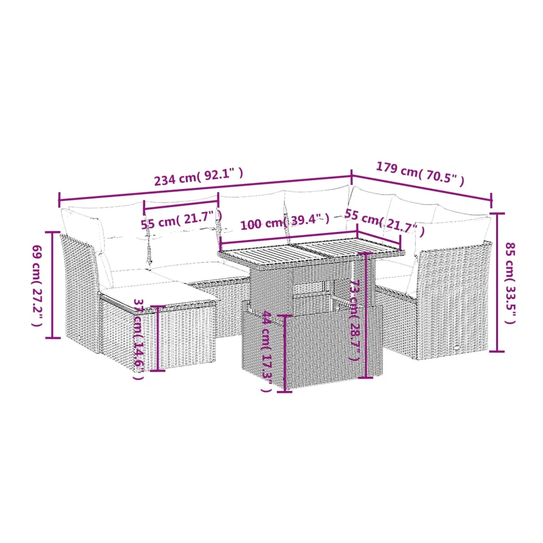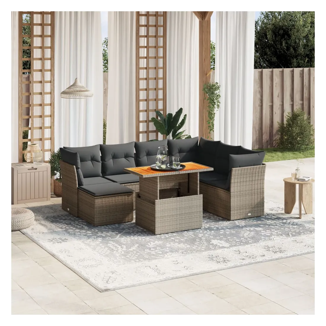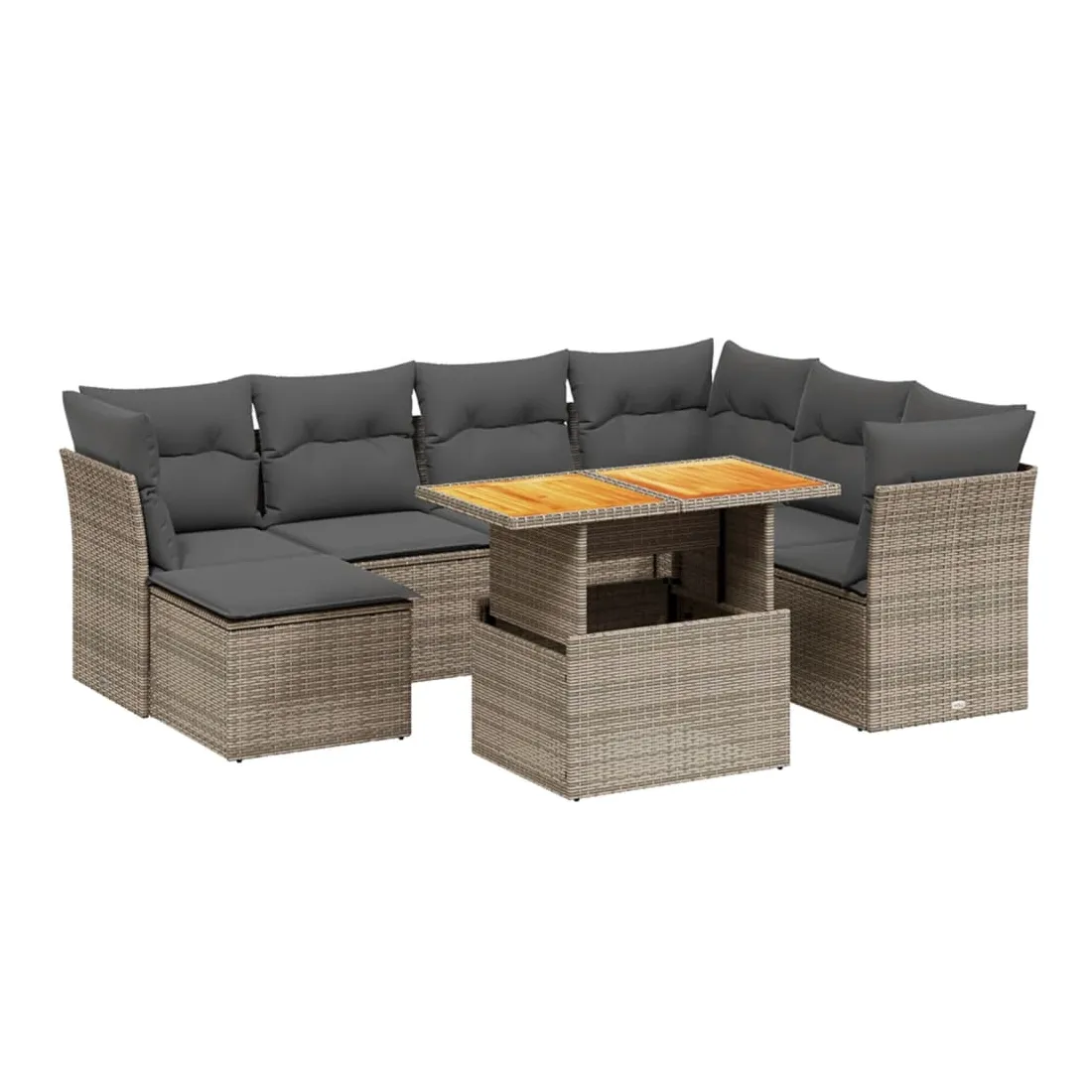 Cet ensemble de canapés de jardin est le complément parfait de votre arrière-cour, terrasse ou patio, offrant un espace confortable et accueillant pour discuter avec la famille et les amis ou simplement se détendre et profiter de l'extérieur. Matériau durable : la résine tressée, également connue sous le nom de poly rotin, est un matériau synthétique solide et nécessitant peu d'entretien qui ressemble au rotin naturel. Il est léger, facile à nettoyer et couramment utilisé pour les meubles d'extérieur en raison de sa durabilité et de ses propriétés de résistance aux intempéries.Dessus de table réglable : le dessus de table peut être soulevé pour rendre la table plus haute, ce qui transforme la table d'extérieur d'une table basse à une table de salle à manger. Elle est parfaite pour recevoir des invités ou prendre des repas à l'extérieur.Expérience d'assise confortable : ce mobilier d'extérieur, doté de coussins épais, offre une expérience d'assise confortable.Housse amovible et lavable : ces coussins de siège sont dotés de housses amovibles pour un lavage et un entretien faciles.Conception modulaire : cet ensemble de meubles d'extérieur a une conception modulaire, ce qui le rend complètement flexible et facile à déplacer, afin que vous puissiez créer un agencement de meubles d'extérieur personnalisé. Bon à savoir :Pour que vos meubles d'extérieur restent beaux, nous vous recommandons de les protéger avec une housse imperméable.