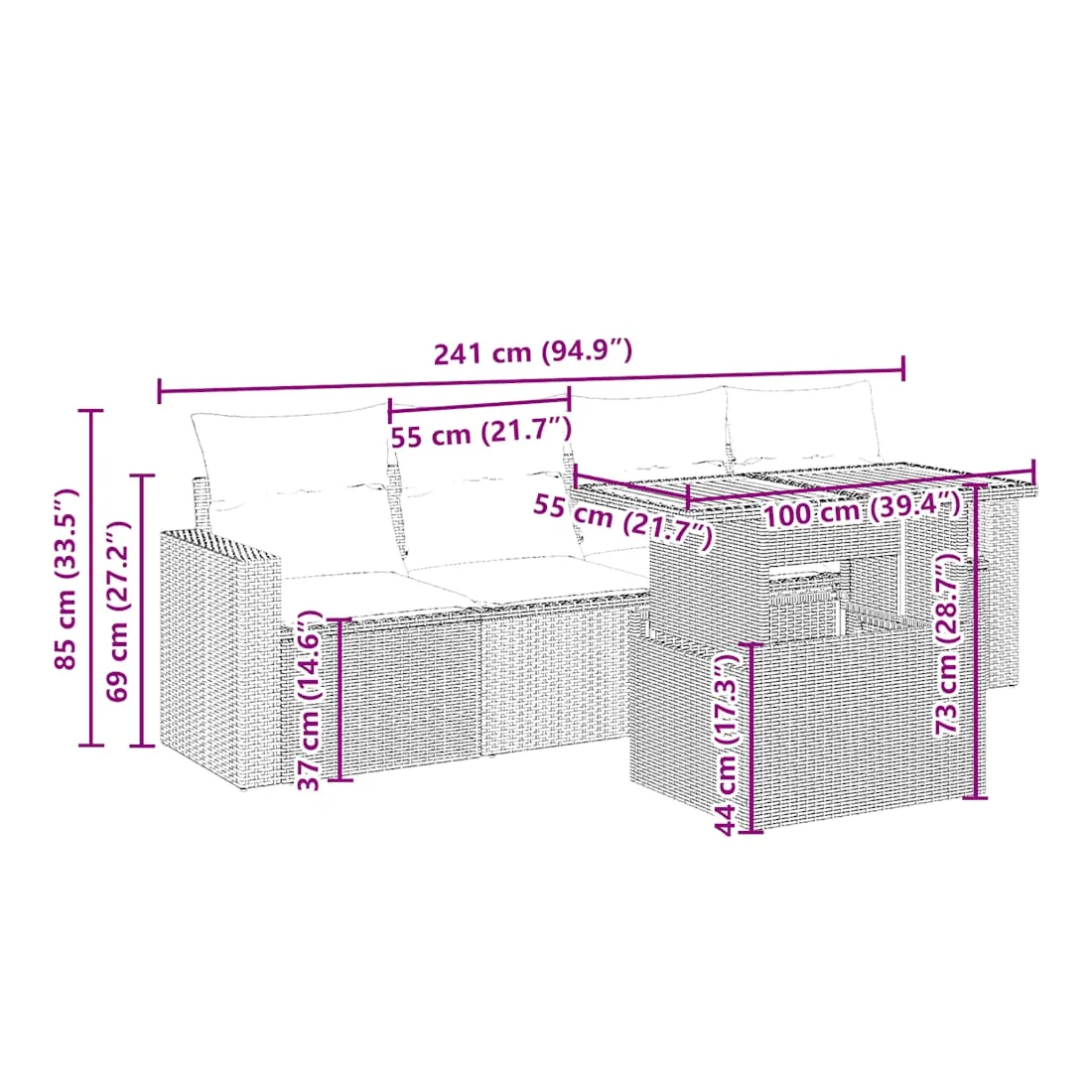 Cet ensemble de canapés de jardin est le complément parfait de votre arrière-cour, terrasse ou patio, offrant un espace confortable et accueillant pour discuter avec la famille et les amis ou simplement se détendre et profiter de l'extérieur. Matériau durable : la résine tressée, également connue sous le nom de poly rotin, est un matériau synthétique solide et nécessitant peu d'entretien qui ressemble au rotin naturel. Il est léger, facile à nettoyer et couramment utilisé pour les meubles d'extérieur en raison de sa durabilité et de ses propriétés de résistance aux intempéries.Dessus de table réglable : le dessus de table peut être soulevé pour rendre la table plus haute, ce qui transforme la table d'extérieur d'une table basse à une table de salle à manger. Elle est parfaite pour recevoir des invités ou prendre des repas à l'extérieur.Expérience d'assise confortable : ce mobilier d'extérieur, doté de coussins épais, offre une expérience d'assise confortable.Housse amovible et lavable : ces coussins de siège sont dotés de housses amovibles pour un lavage et un entretien faciles.Conception modulaire : cet ensemble de meubles d'extérieur a une conception modulaire, ce qui le rend complètement flexible et facile à déplacer, afin que vous puissiez créer un agencement de meubles d'extérieur personnalisé. Bon à savoir :Pour que vos meubles d'extérieur restent beaux, nous vous recommandons de les protéger avec une housse imperméable.