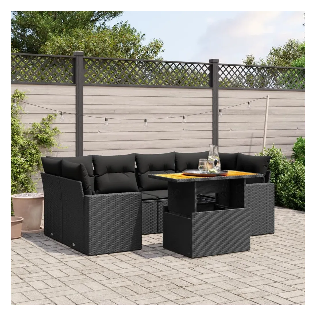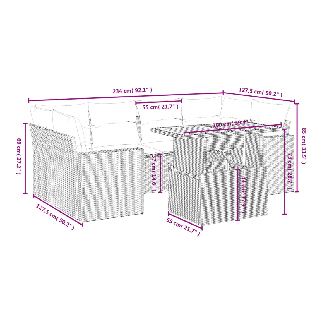 Cet ensemble de canapés de jardin est le complément parfait de votre arrière-cour, terrasse ou patio, offrant un espace confortable et accueillant pour discuter avec la famille et les amis ou simplement se détendre et profiter de l'extérieur. Matériau durable : la résine tressée, également connue sous le nom de poly rotin, est un matériau synthétique solide et nécessitant peu d'entretien qui ressemble au rotin naturel. Il est léger, facile à nettoyer et couramment utilisé pour les meubles d'extérieur en raison de sa durabilité et de ses propriétés de résistance aux intempéries.Dessus de table réglable : le dessus de table peut être soulevé pour rendre la table plus haute, ce qui transforme la table d'extérieur d'une table basse à une table de salle à manger. Elle est parfaite pour recevoir des invités ou prendre des repas à l'extérieur.Expérience d'assise confortable : ce mobilier d'extérieur, doté de coussins épais, offre une expérience d'assise confortable.Housse amovible et lavable : ces coussins de siège sont dotés de housses amovibles pour un lavage et un entretien faciles.Conception modulaire : cet ensemble de meubles d'extérieur a une conception modulaire, ce qui le rend complètement flexible et facile à déplacer, afin que vous puissiez créer un agencement de meubles d'extérieur personnalisé. Bon à savoir :Pour que vos meubles d'extérieur restent beaux, nous vous recommandons de les protéger avec une housse imperméable.