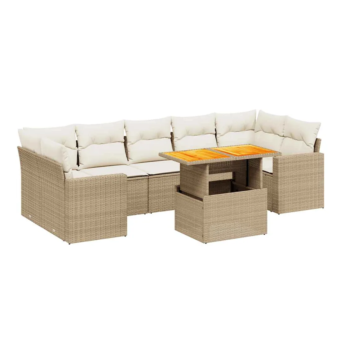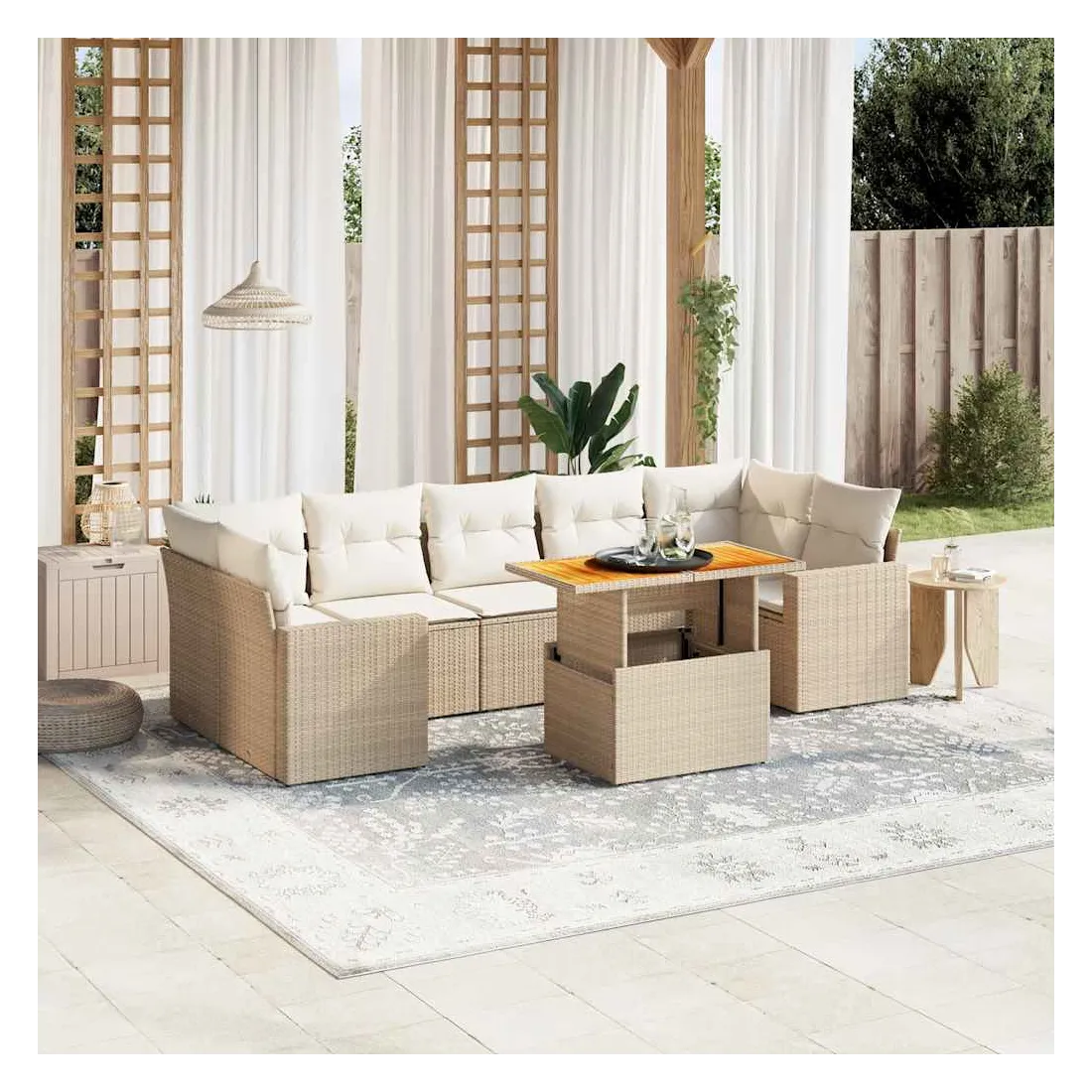 Cet ensemble de canapés de jardin est le complément parfait de votre arrière-cour, terrasse ou patio, offrant un espace confortable et accueillant pour discuter avec la famille et les amis ou simplement se détendre et profiter de l'extérieur. Matériau durable : la résine tressée, également connue sous le nom de poly rotin, est un matériau synthétique solide et nécessitant peu d'entretien qui ressemble au rotin naturel. Il est léger, facile à nettoyer et couramment utilisé pour les meubles d'extérieur en raison de sa durabilité et de ses propriétés de résistance aux intempéries.Dessus de table réglable : le dessus de table peut être soulevé pour rendre la table plus haute, ce qui transforme la table d'extérieur d'une table basse à une table de salle à manger. Elle est parfaite pour recevoir des invités ou prendre des repas à l'extérieur.Expérience d'assise confortable : ce mobilier d'extérieur, doté de coussins épais, offre une expérience d'assise confortable.Housse amovible et lavable : ces coussins de siège sont dotés de housses amovibles pour un lavage et un entretien faciles.Conception modulaire : cet ensemble de meubles d'extérieur a une conception modulaire, ce qui le rend complètement flexible et facile à déplacer, afin que vous puissiez créer un agencement de meubles d'extérieur personnalisé. Bon à savoir :Pour que vos meubles d'extérieur restent beaux, nous vous recommandons de les protéger avec une housse imperméable.