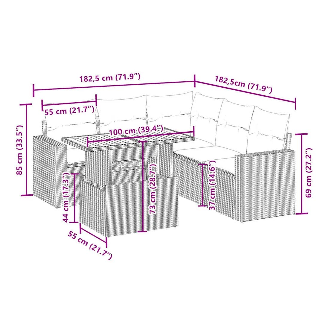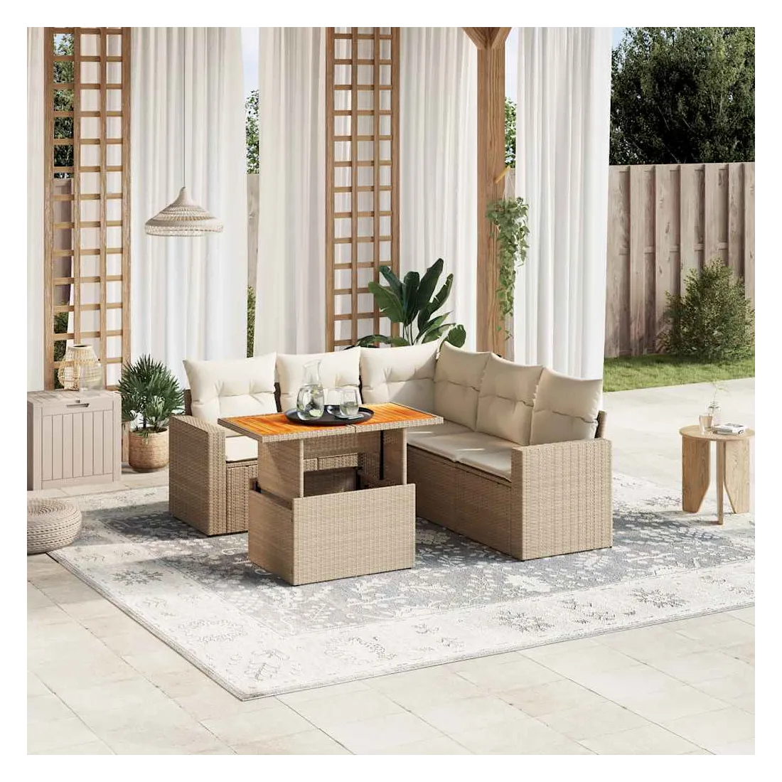 Cet ensemble de canapés de jardin est le complément parfait de votre arrière-cour, terrasse ou patio, offrant un espace confortable et accueillant pour discuter avec la famille et les amis ou simplement se détendre et profiter de l'extérieur. Matériau durable : la résine tressée, également connue sous le nom de poly rotin, est un matériau synthétique solide et nécessitant peu d'entretien qui ressemble au rotin naturel. Il est léger, facile à nettoyer et couramment utilisé pour les meubles d'extérieur en raison de sa durabilité et de ses propriétés de résistance aux intempéries.Dessus de table réglable : le dessus de table peut être soulevé pour rendre la table plus haute, ce qui transforme la table d'extérieur d'une table basse à une table de salle à manger. Elle est parfaite pour recevoir des invités ou prendre des repas à l'extérieur.Expérience d'assise confortable : ce mobilier d'extérieur, doté de coussins épais, offre une expérience d'assise confortable.Housse amovible et lavable : ces coussins de siège sont dotés de housses amovibles pour un lavage et un entretien faciles.Conception modulaire : cet ensemble de meubles d'extérieur a une conception modulaire, ce qui le rend complètement flexible et facile à déplacer, afin que vous puissiez créer un agencement de meubles d'extérieur personnalisé. Bon à savoir :Pour que vos meubles d'extérieur restent beaux, nous vous recommandons de les protéger avec une housse imperméable.