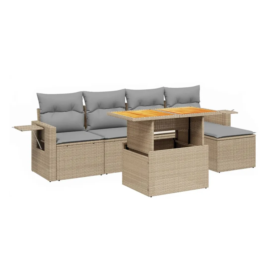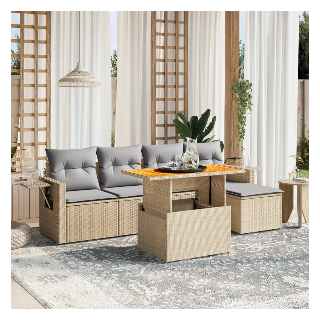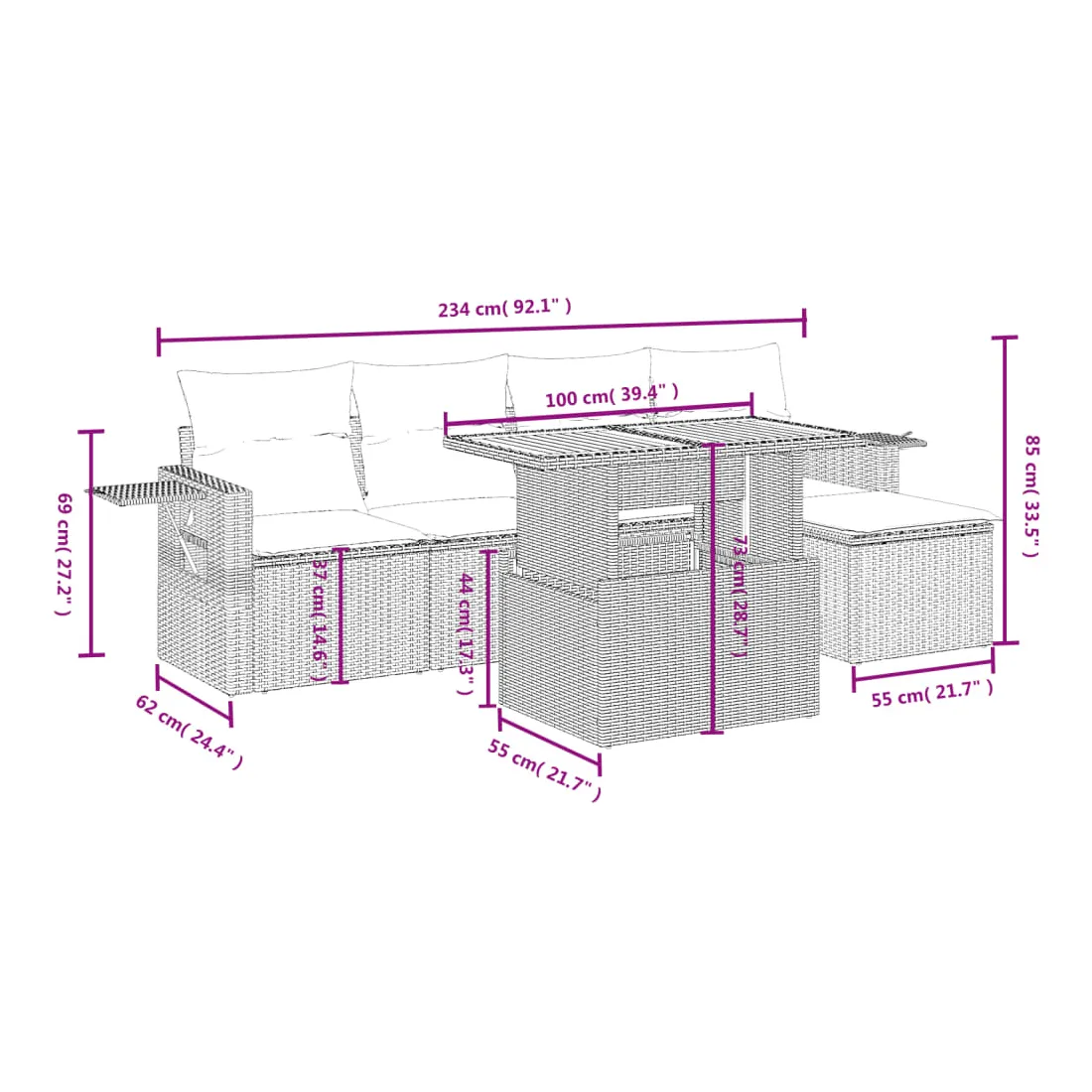Cet ensemble de canapés de jardin est le complément parfait de votre arrière-cour, terrasse ou patio, offrant un espace confortable et accueillant pour discuter avec la famille et les amis ou simplement se détendre et profiter de l'extérieur. Matériau durable : la résine tressée, également connue sous le nom de poly rotin, est un matériau synthétique solide et nécessitant peu d'entretien qui ressemble au rotin naturel. Il est léger, facile à nettoyer et couramment utilisé pour les meubles d'extérieur en raison de sa durabilité et de ses propriétés de résistance aux intempéries.Dessus de table réglable : le dessus de table peut être soulevé pour rendre la table plus haute, ce qui transforme la table d'extérieur d'une table basse à une table de salle à manger. Elle est parfaite pour recevoir des invités ou prendre des repas à l'extérieur.Table d'appoint pratique : ce mobilier d'extérieur comprend une table d'appoint pliable avec un ressort à gaz sur les accoudoirs, offrant un endroit pratique pour garder vos essentiels à portée de main.Housse amovible et lavable : ces coussins de siège sont dotés de housses amovibles pour un lavage et un entretien faciles.Conception modulaire : cet ensemble de meubles d'extérieur a une conception modulaire, ce qui le rend complètement flexible et facile à déplacer, afin que vous puissiez créer un agencement de meubles d'extérieur personnalisé. Bon à savoir :Pour que vos meubles d'extérieur restent beaux, nous vous recommandons de les protéger avec une housse imperméable.