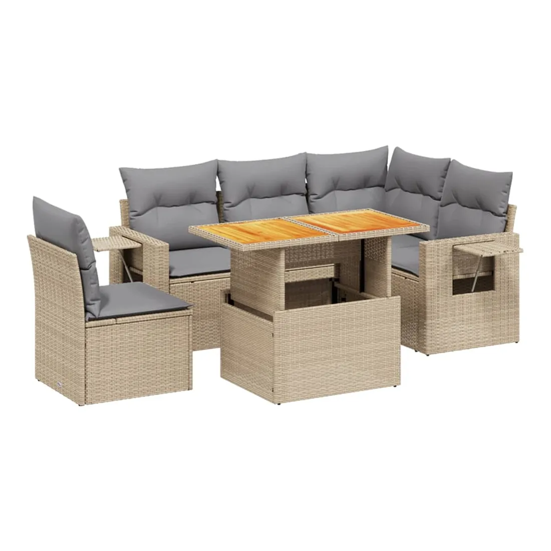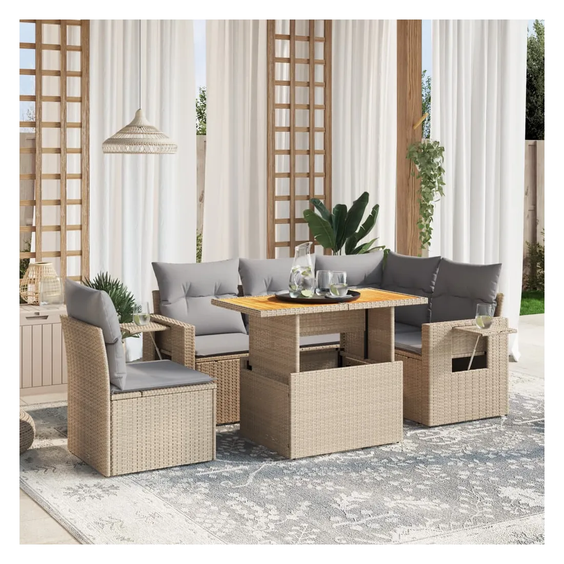 Cet ensemble de canapés de jardin est le complément parfait de votre arrière-cour, terrasse ou patio, offrant un espace confortable et accueillant pour discuter avec la famille et les amis ou simplement se détendre et profiter de l'extérieur. Matériau durable : la résine tressée, également connue sous le nom de poly rotin, est un matériau synthétique solide et nécessitant peu d'entretien qui ressemble au rotin naturel. Il est léger, facile à nettoyer et couramment utilisé pour les meubles d'extérieur en raison de sa durabilité et de ses propriétés de résistance aux intempéries.Dessus de table réglable : le dessus de table peut être soulevé pour rendre la table plus haute, ce qui transforme la table d'extérieur d'une table basse à une table de salle à manger. Elle est parfaite pour recevoir des invités ou prendre des repas à l'extérieur.Table d'appoint pratique : ce mobilier d'extérieur comprend une table d'appoint pliable avec un ressort à gaz sur les accoudoirs, offrant un endroit pratique pour garder vos essentiels à portée de main.Housse amovible et lavable : ces coussins de siège sont dotés de housses amovibles pour un lavage et un entretien faciles.Conception modulaire : cet ensemble de meubles d'extérieur a une conception modulaire, ce qui le rend complètement flexible et facile à déplacer, afin que vous puissiez créer un agencement de meubles d'extérieur personnalisé. Bon à savoir :Pour que vos meubles d'extérieur restent beaux, nous vous recommandons de les protéger avec une housse imperméable.
