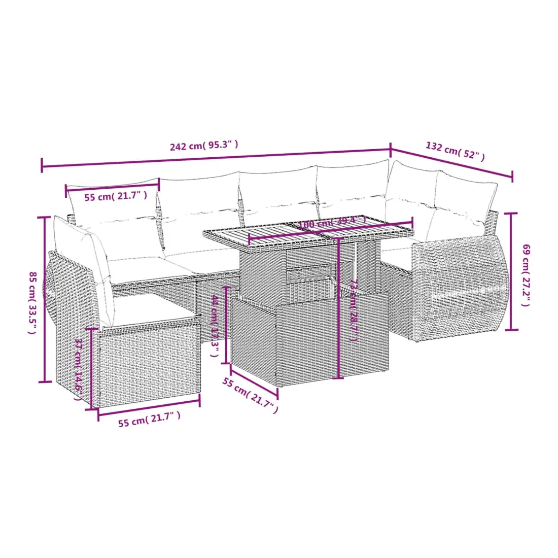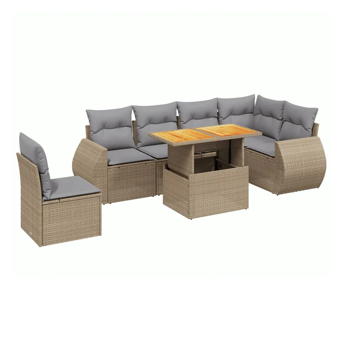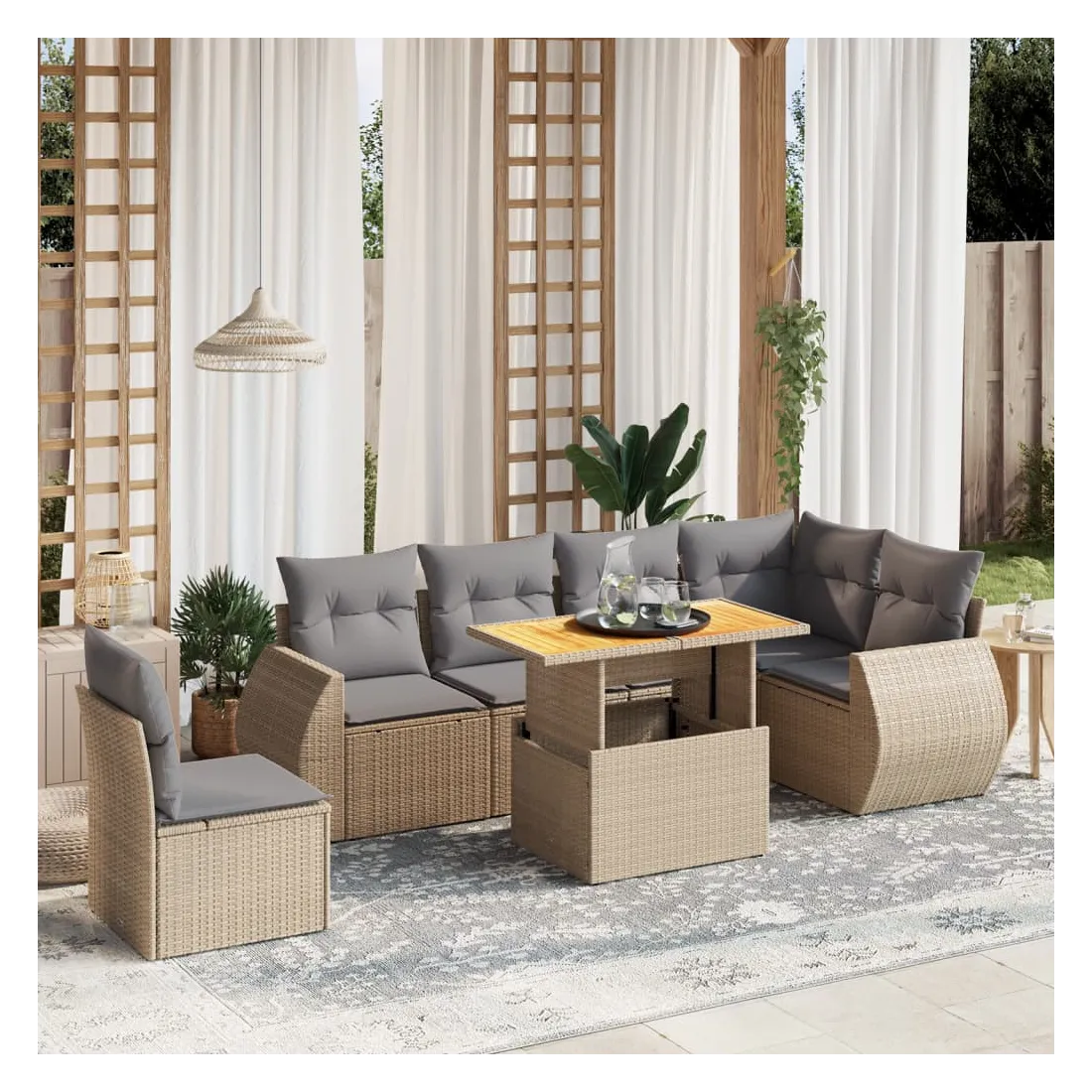 Cet ensemble de canapés de jardin est le complément parfait de votre arrière-cour, terrasse ou patio, offrant un espace confortable et accueillant pour discuter avec la famille et les amis ou simplement se détendre et profiter de l'extérieur. Matériau durable : la résine tressée, également connue sous le nom de poly rotin, est un matériau synthétique solide et nécessitant peu d'entretien qui ressemble au rotin naturel. Il est léger, facile à nettoyer et couramment utilisé pour les meubles d'extérieur en raison de sa durabilité et de ses propriétés de résistance aux intempéries.Dessus de table réglable : le dessus de table peut être soulevé pour rendre la table plus haute, ce qui transforme la table d'extérieur d'une table basse à une table de salle à manger. Elle est parfaite pour recevoir des invités ou prendre des repas à l'extérieur.Expérience d'assise confortable : ce mobilier d'extérieur, doté de coussins épais, offre une expérience d'assise confortable.Housse amovible et lavable : ces coussins de siège sont dotés de housses amovibles pour un lavage et un entretien faciles.Conception modulaire : cet ensemble de meubles d'extérieur a une conception modulaire, ce qui le rend complètement flexible et facile à déplacer, afin que vous puissiez créer un agencement de meubles d'extérieur personnalisé. Bon à savoir :Pour que vos meubles d'extérieur restent beaux, nous vous recommandons de les protéger avec une housse imperméable.