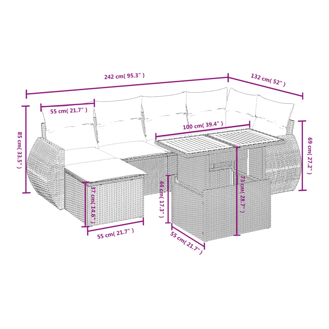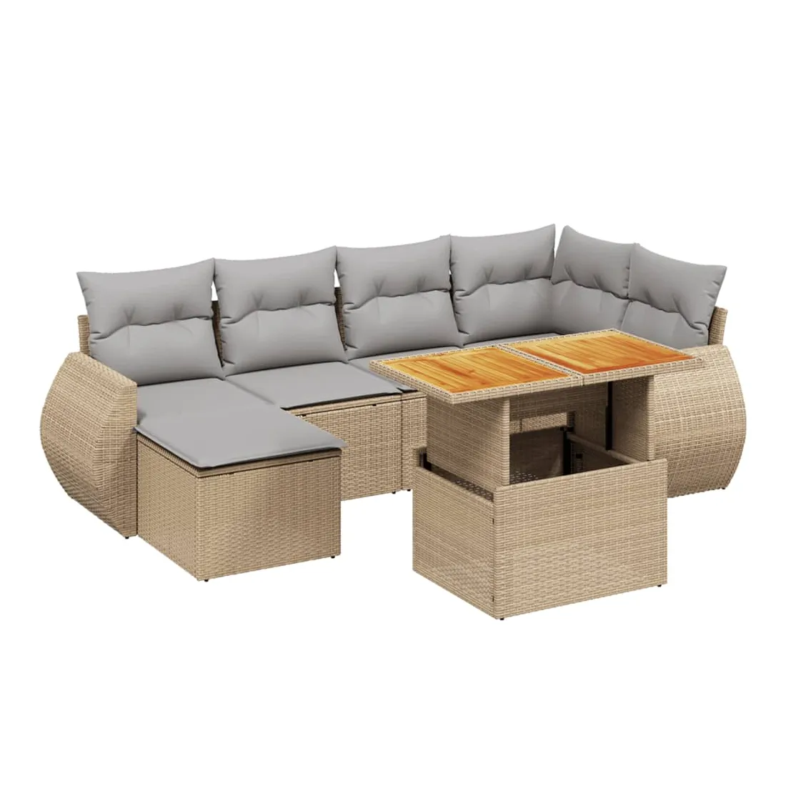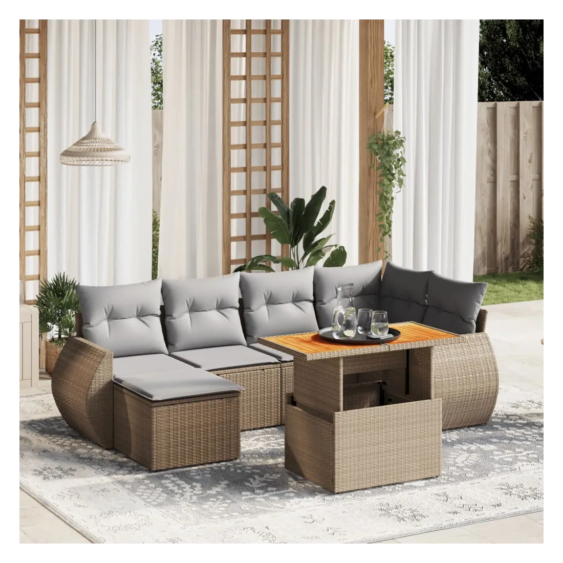 Cet ensemble de canapés de jardin est le complément parfait de votre arrière-cour, terrasse ou patio, offrant un espace confortable et accueillant pour discuter avec la famille et les amis ou simplement se détendre et profiter de l'extérieur. Matériau durable : la résine tressée, également connue sous le nom de poly rotin, est un matériau synthétique solide et nécessitant peu d'entretien qui ressemble au rotin naturel. Il est léger, facile à nettoyer et couramment utilisé pour les meubles d'extérieur en raison de sa durabilité et de ses propriétés de résistance aux intempéries.Dessus de table réglable : le dessus de table peut être soulevé pour rendre la table plus haute, ce qui transforme la table d'extérieur d'une table basse à une table de salle à manger. Elle est parfaite pour recevoir des invités ou prendre des repas à l'extérieur.Expérience d'assise confortable : ce mobilier d'extérieur, doté de coussins épais, offre une expérience d'assise confortable.Housse amovible et lavable : ces coussins de siège sont dotés de housses amovibles pour un lavage et un entretien faciles.Conception modulaire : cet ensemble de meubles d'extérieur a une conception modulaire, ce qui le rend complètement flexible et facile à déplacer, afin que vous puissiez créer un agencement de meubles d'extérieur personnalisé. Bon à savoir :Pour que vos meubles d'extérieur restent beaux, nous vous recommandons de les protéger avec une housse imperméable.