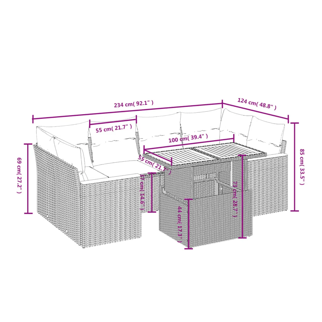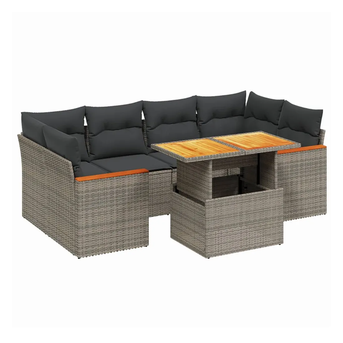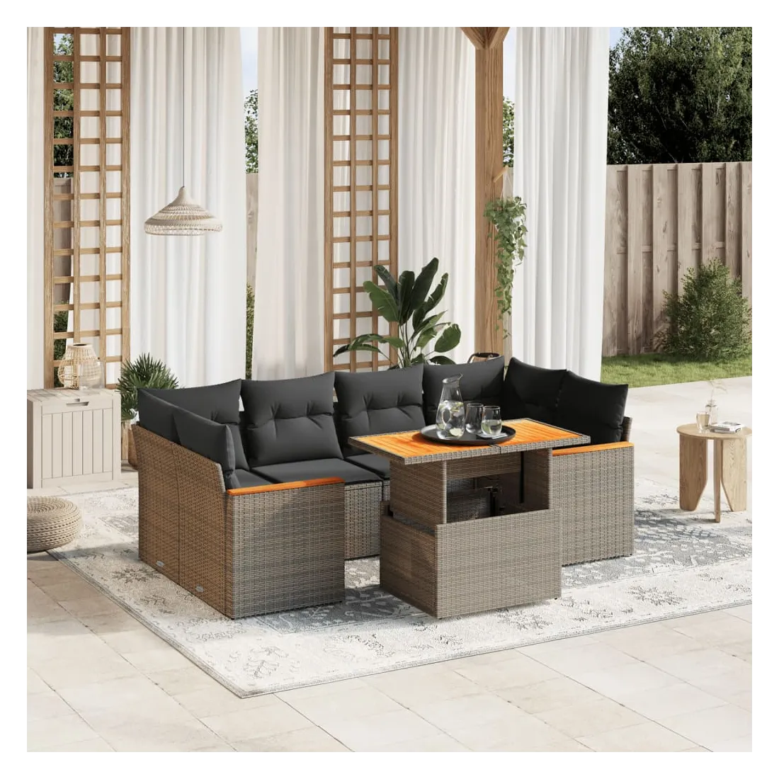 Cet ensemble de canapés de jardin est le complément parfait de votre arrière-cour, terrasse ou patio, offrant un espace confortable et accueillant pour discuter avec la famille et les amis ou simplement se détendre et profiter de l'extérieur. Matériau durable : la résine tressée, également connue sous le nom de poly rotin, est un matériau synthétique solide et nécessitant peu d'entretien qui ressemble au rotin naturel. Il est léger, facile à nettoyer et couramment utilisé pour les meubles d'extérieur en raison de sa durabilité et de ses propriétés de résistance aux intempéries.Dessus de table réglable : le dessus de table peut être soulevé pour rendre la table plus haute, ce qui transforme la table d'extérieur d'une table basse à une table de salle à manger. Elle est parfaite pour recevoir des invités ou prendre des repas à l'extérieur.Expérience d'assise confortable : ce mobilier d'extérieur, doté de coussins épais, offre une expérience d'assise confortable.Housse amovible et lavable : ces coussins de siège sont dotés de housses amovibles pour un lavage et un entretien faciles.Conception modulaire : cet ensemble de meubles d'extérieur a une conception modulaire, ce qui le rend complètement flexible et facile à déplacer, afin que vous puissiez créer un agencement de meubles d'extérieur personnalisé. Bon à savoir :Pour que vos meubles d'extérieur restent beaux, nous vous recommandons de les protéger avec une housse imperméable.
