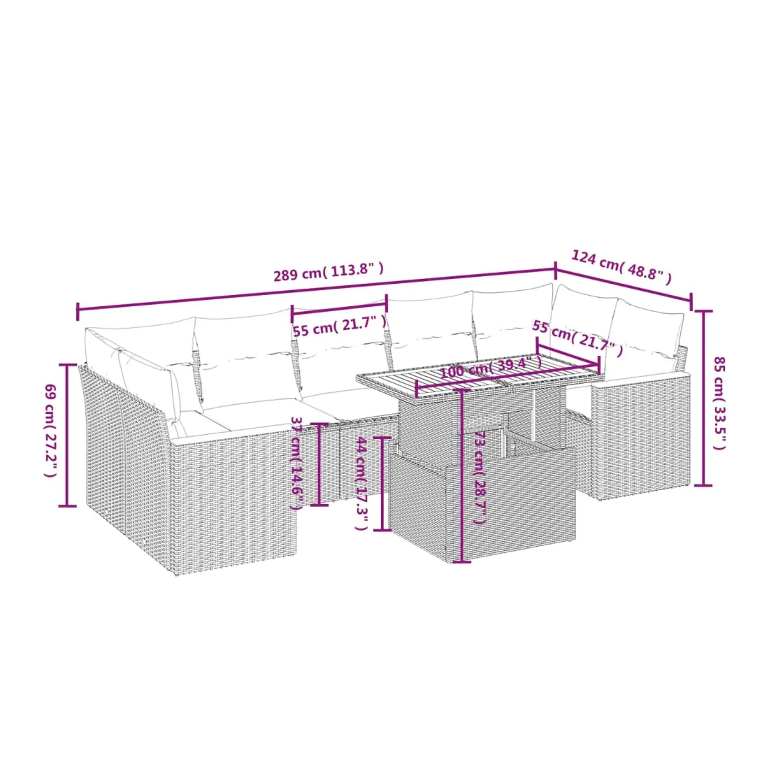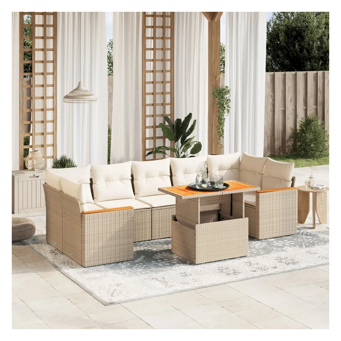 Cet ensemble de canapés de jardin est le complément parfait de votre arrière-cour, terrasse ou patio, offrant un espace confortable et accueillant pour discuter avec la famille et les amis ou simplement se détendre et profiter de l'extérieur. Matériau durable : la résine tressée, également connue sous le nom de poly rotin, est un matériau synthétique solide et nécessitant peu d'entretien qui ressemble au rotin naturel. Il est léger, facile à nettoyer et couramment utilisé pour les meubles d'extérieur en raison de sa durabilité et de ses propriétés de résistance aux intempéries.Dessus de table réglable : le dessus de table peut être soulevé pour rendre la table plus haute, ce qui transforme la table d'extérieur d'une table basse à une table de salle à manger. Elle est parfaite pour recevoir des invités ou prendre des repas à l'extérieur.Expérience d'assise confortable : ce mobilier d'extérieur, doté de coussins épais, offre une expérience d'assise confortable.Housse amovible et lavable : ces coussins de siège sont dotés de housses amovibles pour un lavage et un entretien faciles.Conception modulaire : cet ensemble de meubles d'extérieur a une conception modulaire, ce qui le rend complètement flexible et facile à déplacer, afin que vous puissiez créer un agencement de meubles d'extérieur personnalisé. Bon à savoir :Pour que vos meubles d'extérieur restent beaux, nous vous recommandons de les protéger avec une housse imperméable.