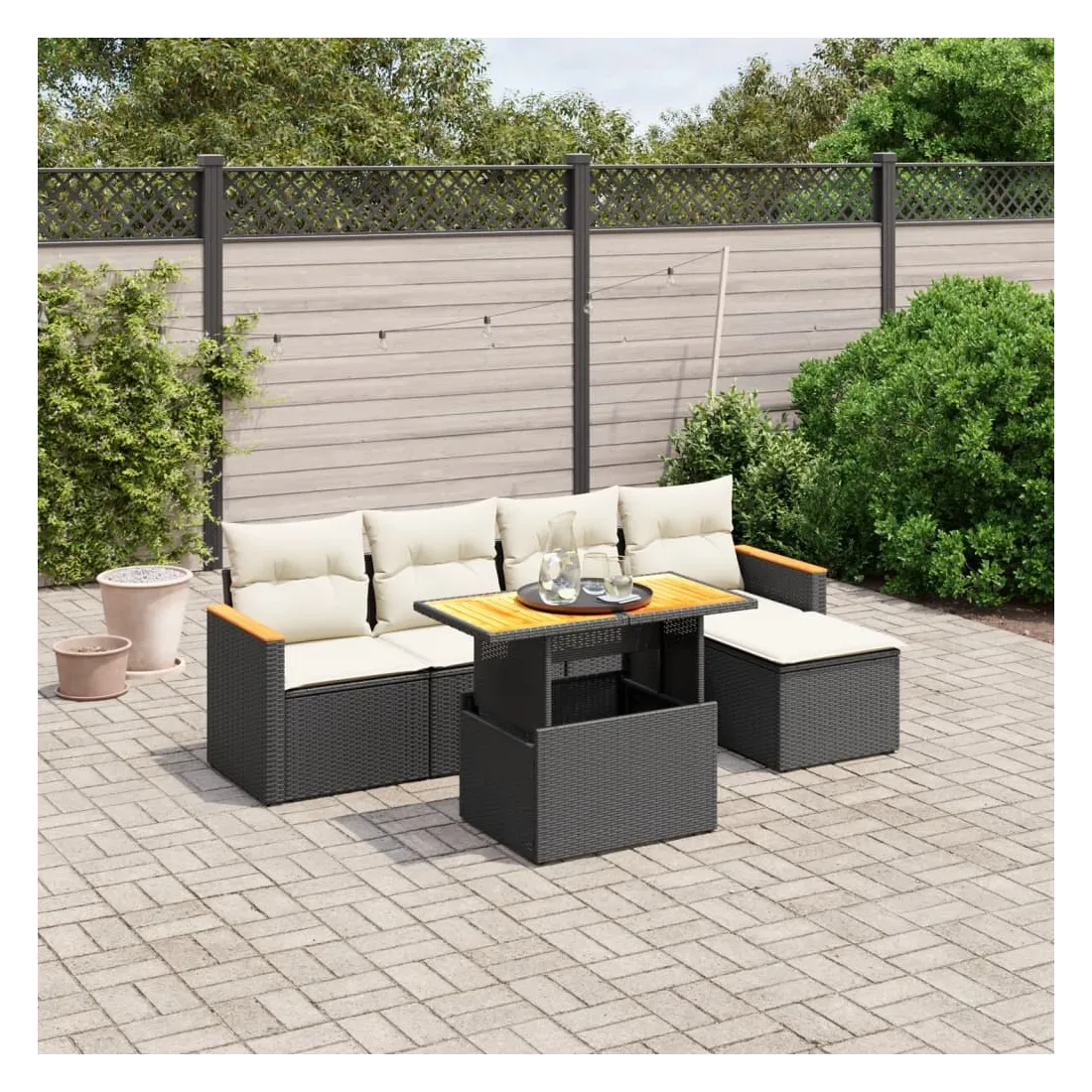 Cet ensemble de canapés de jardin est le complément parfait de votre arrière-cour, terrasse ou patio, offrant un espace confortable et accueillant pour discuter avec la famille et les amis ou simplement se détendre et profiter de l'extérieur. Matériau durable : la résine tressée, également connue sous le nom de poly rotin, est un matériau synthétique solide et nécessitant peu d'entretien qui ressemble au rotin naturel. Il est léger, facile à nettoyer et couramment utilisé pour les meubles d'extérieur en raison de sa durabilité et de ses propriétés de résistance aux intempéries.Dessus de table réglable : le dessus de table peut être soulevé pour rendre la table plus haute, ce qui transforme la table d'extérieur d'une table basse à une table de salle à manger. Elle est parfaite pour recevoir des invités ou prendre des repas à l'extérieur.Expérience d'assise confortable : ce mobilier d'extérieur, doté de coussins épais, offre une expérience d'assise confortable.Housse amovible et lavable : ces coussins de siège sont dotés de housses amovibles pour un lavage et un entretien faciles.Conception modulaire : cet ensemble de meubles d'extérieur a une conception modulaire, ce qui le rend complètement flexible et facile à déplacer, afin que vous puissiez créer un agencement de meubles d'extérieur personnalisé. Bon à savoir :Pour que vos meubles d'extérieur restent beaux, nous vous recommandons de les protéger avec une housse imperméable.