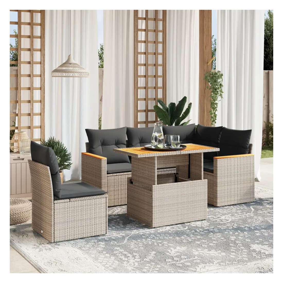 Cet ensemble de canapés de jardin est le complément parfait de votre arrière-cour, terrasse ou patio, offrant un espace confortable et accueillant pour discuter avec la famille et les amis ou simplement se détendre et profiter de l'extérieur. Matériau durable : la résine tressée, également connue sous le nom de poly rotin, est un matériau synthétique solide et nécessitant peu d'entretien qui ressemble au rotin naturel. Il est léger, facile à nettoyer et couramment utilisé pour les meubles d'extérieur en raison de sa durabilité et de ses propriétés de résistance aux intempéries.Dessus de table réglable : le dessus de table peut être soulevé pour rendre la table plus haute, ce qui transforme la table d'extérieur d'une table basse à une table de salle à manger. Elle est parfaite pour recevoir des invités ou prendre des repas à l'extérieur.Expérience d'assise confortable : ce mobilier d'extérieur, doté de coussins épais, offre une expérience d'assise confortable.Housse amovible et lavable : ces coussins de siège sont dotés de housses amovibles pour un lavage et un entretien faciles.Conception modulaire : cet ensemble de meubles d'extérieur a une conception modulaire, ce qui le rend complètement flexible et facile à déplacer, afin que vous puissiez créer un agencement de meubles d'extérieur personnalisé. Bon à savoir :Pour que vos meubles d'extérieur restent beaux, nous vous recommandons de les protéger avec une housse imperméable.