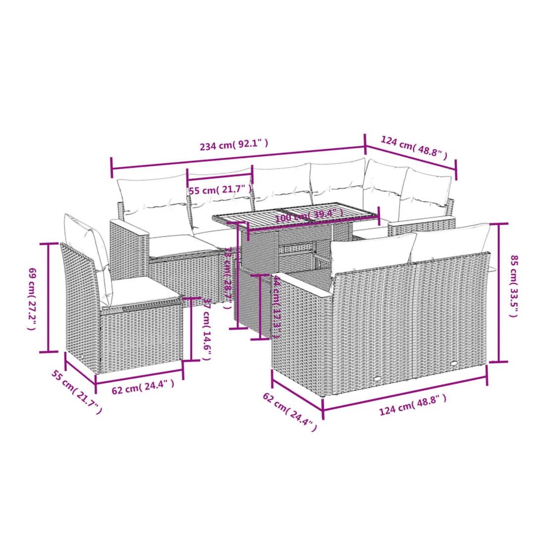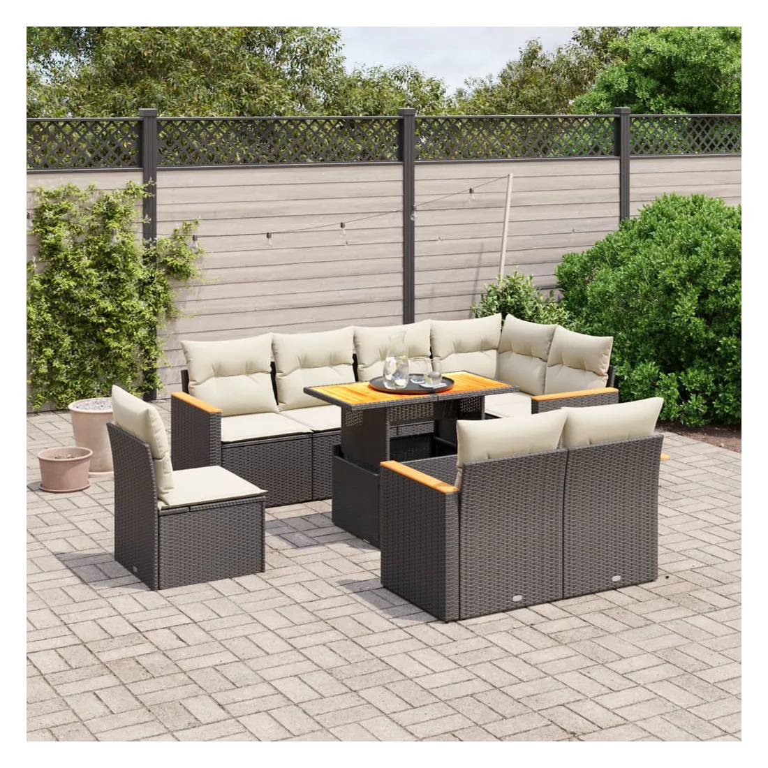 Cet ensemble de canapés de jardin est le complément parfait de votre arrière-cour, terrasse ou patio, offrant un espace confortable et accueillant pour discuter avec la famille et les amis ou simplement se détendre et profiter de l'extérieur. Matériau durable : la résine tressée, également connue sous le nom de poly rotin, est un matériau synthétique solide et nécessitant peu d'entretien qui ressemble au rotin naturel. Il est léger, facile à nettoyer et couramment utilisé pour les meubles d'extérieur en raison de sa durabilité et de ses propriétés de résistance aux intempéries.Dessus de table réglable : le dessus de table peut être soulevé pour rendre la table plus haute, ce qui transforme la table d'extérieur d'une table basse à une table de salle à manger. Elle est parfaite pour recevoir des invités ou prendre des repas à l'extérieur.Expérience d'assise confortable : ce mobilier d'extérieur, doté de coussins épais, offre une expérience d'assise confortable.Housse amovible et lavable : ces coussins de siège sont dotés de housses amovibles pour un lavage et un entretien faciles.Conception modulaire : cet ensemble de meubles d'extérieur a une conception modulaire, ce qui le rend complètement flexible et facile à déplacer, afin que vous puissiez créer un agencement de meubles d'extérieur personnalisé. Bon à savoir :Pour que vos meubles d'extérieur restent beaux, nous vous recommandons de les protéger avec une housse imperméable.