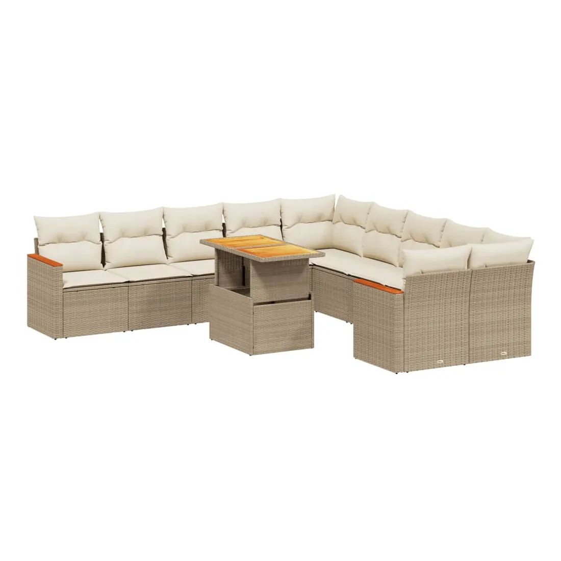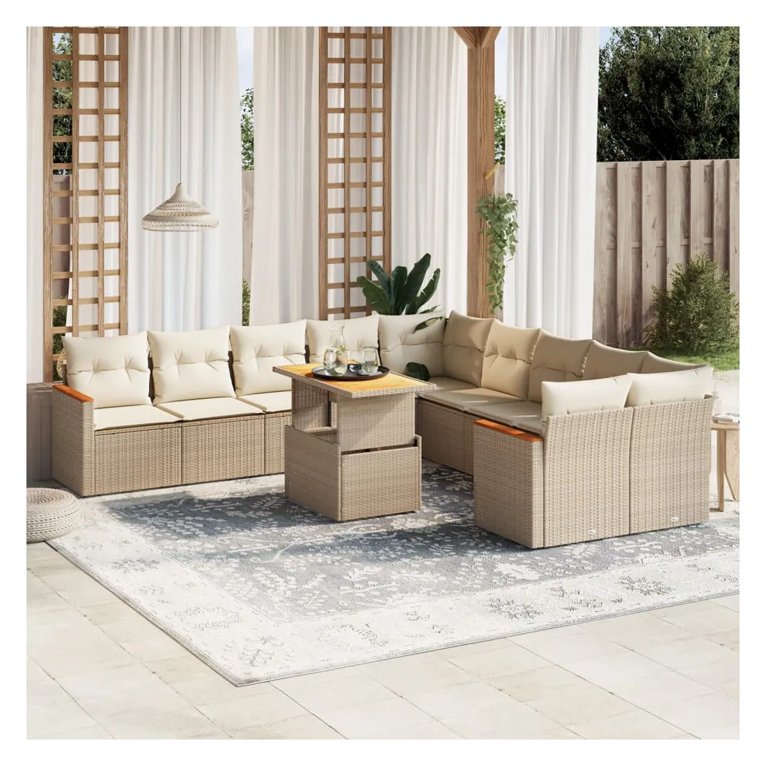 Cet ensemble de canapés de jardin est le complément parfait de votre arrière-cour, terrasse ou patio, offrant un espace confortable et accueillant pour discuter avec la famille et les amis ou simplement se détendre et profiter de l'extérieur. Matériau durable : la résine tressée, également connue sous le nom de poly rotin, est un matériau synthétique solide et nécessitant peu d'entretien qui ressemble au rotin naturel. Il est léger, facile à nettoyer et couramment utilisé pour les meubles d'extérieur en raison de sa durabilité et de ses propriétés de résistance aux intempéries.Dessus de table réglable : le dessus de table peut être soulevé pour rendre la table plus haute, ce qui transforme la table d'extérieur d'une table basse à une table de salle à manger. Elle est parfaite pour recevoir des invités ou prendre des repas à l'extérieur.Expérience d'assise confortable : ce mobilier d'extérieur, doté de coussins épais, offre une expérience d'assise confortable.Housse amovible et lavable : ces coussins de siège sont dotés de housses amovibles pour un lavage et un entretien faciles.Conception modulaire : cet ensemble de meubles d'extérieur a une conception modulaire, ce qui le rend complètement flexible et facile à déplacer, afin que vous puissiez créer un agencement de meubles d'extérieur personnalisé. Bon à savoir :Pour que vos meubles d'extérieur restent beaux, nous vous recommandons de les protéger avec une housse imperméable.