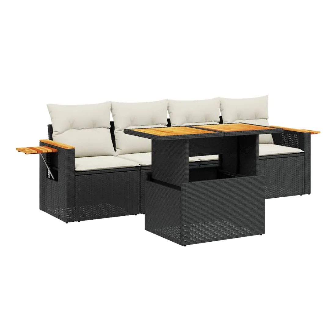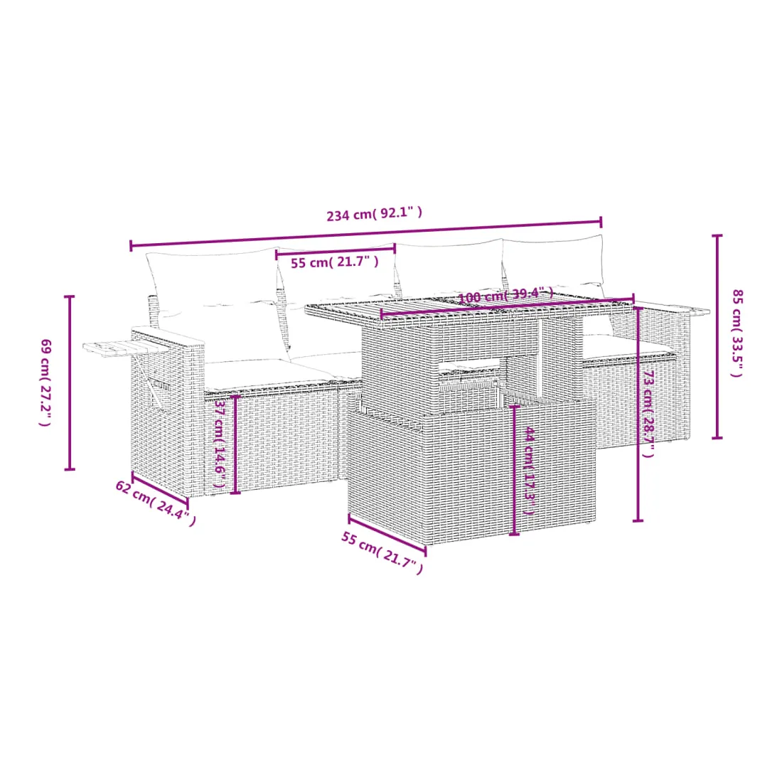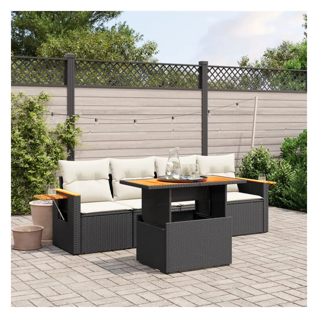 Cet ensemble de canapés de jardin est le complément parfait de votre arrière-cour, terrasse ou patio, offrant un espace confortable et accueillant pour discuter avec la famille et les amis ou simplement se détendre et profiter de l'extérieur. Matériau durable : la résine tressée, également connue sous le nom de poly rotin, est un matériau synthétique solide et nécessitant peu d'entretien qui ressemble au rotin naturel. Il est léger, facile à nettoyer et couramment utilisé pour les meubles d'extérieur en raison de sa durabilité et de ses propriétés de résistance aux intempéries.Dessus de table réglable : le dessus de table peut être soulevé pour rendre la table plus haute, ce qui transforme la table d'extérieur d'une table basse à une table de salle à manger. Elle est parfaite pour recevoir des invités ou prendre des repas à l'extérieur.Table d'appoint pratique : ce mobilier d'extérieur comprend une table d'appoint pliable avec un ressort à gaz sur les accoudoirs, offrant un endroit pratique pour garder vos essentiels à portée de main.Housse amovible et lavable : ces coussins de siège sont dotés de housses amovibles pour un lavage et un entretien faciles.Conception modulaire : cet ensemble de meubles d'extérieur a une conception modulaire, ce qui le rend complètement flexible et facile à déplacer, afin que vous puissiez créer un agencement de meubles d'extérieur personnalisé. Bon à savoir :Pour que vos meubles d'extérieur restent beaux, nous vous recommandons de les protéger avec une housse imperméable.