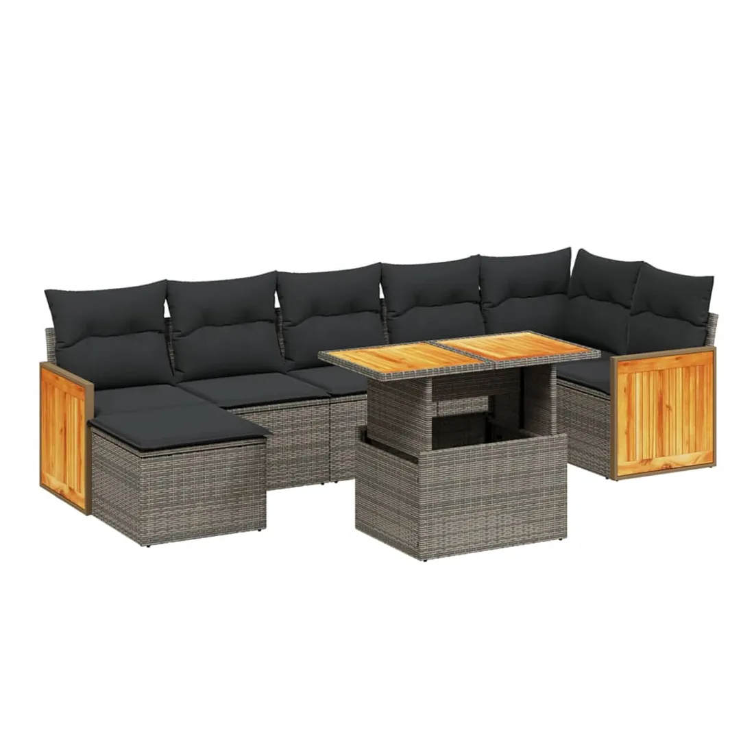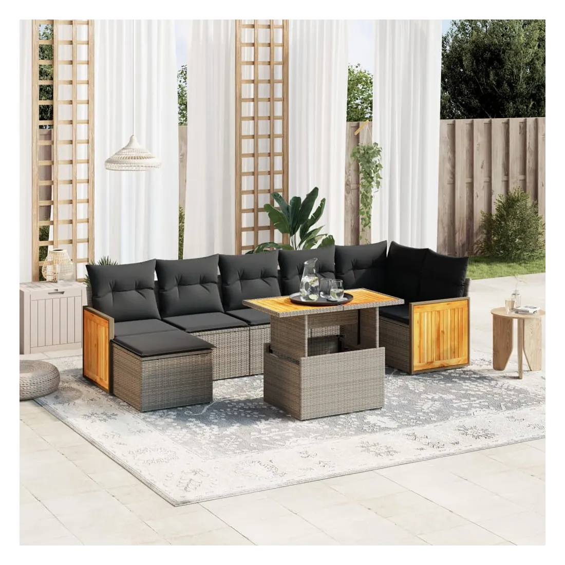 Cet ensemble de canapés de jardin est le complément parfait de votre arrière-cour, terrasse ou patio, offrant un espace confortable et accueillant pour discuter avec la famille et les amis ou simplement se détendre et profiter de l'extérieur. Matériau durable : la résine tressée, également connue sous le nom de poly rotin, est un matériau synthétique solide et nécessitant peu d'entretien qui ressemble au rotin naturel. Il est léger, facile à nettoyer et couramment utilisé pour les meubles d'extérieur en raison de sa durabilité et de ses propriétés de résistance aux intempéries.Dessus de table réglable : le dessus de table peut être soulevé pour rendre la table plus haute, ce qui transforme la table d'extérieur d'une table basse à une table de salle à manger. Elle est parfaite pour recevoir des invités ou prendre des repas à l'extérieur.Housse amovible et lavable : ces coussins de siège sont dotés de housses amovibles pour un lavage et un entretien faciles.Conception modulaire : cet ensemble de meubles d'extérieur a une conception modulaire, ce qui le rend complètement flexible et facile à déplacer, afin que vous puissiez créer un agencement de meubles d'extérieur personnalisé. Bon à savoir :Pour que vos meubles d'extérieur restent beaux, nous vous recommandons de les protéger avec une housse imperméable.