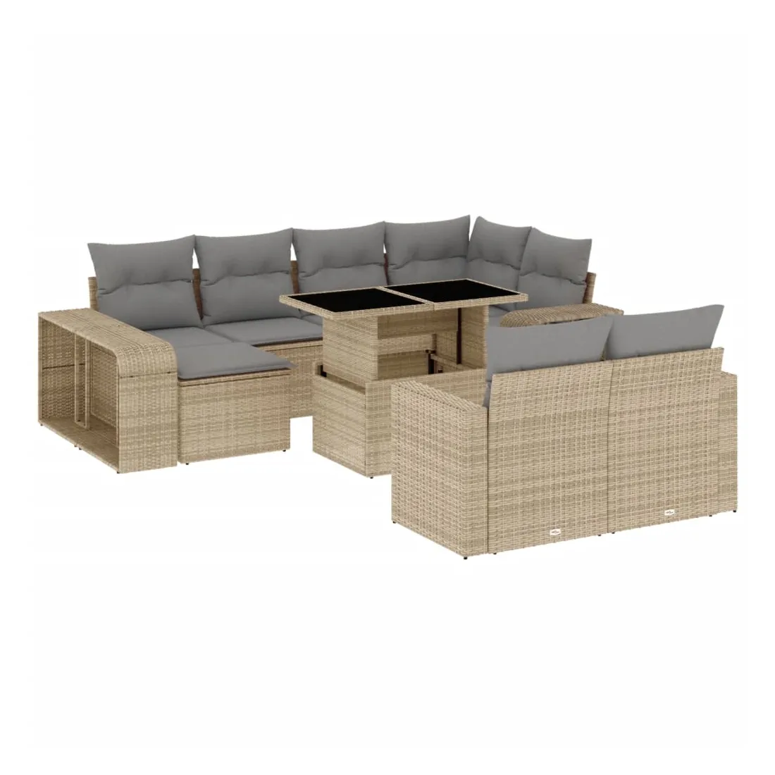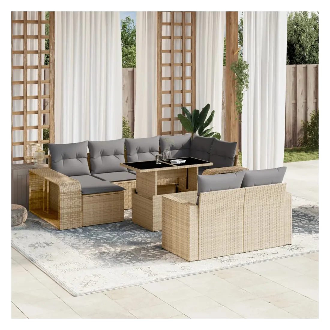 Cet ensemble de canapés de jardin est le complément parfait de votre arrière-cour, terrasse ou patio, offrant un espace confortable et accueillant pour discuter avec la famille et les amis ou simplement se détendre et profiter de l'extérieur. Matériau durable : la résine tressée, également connue sous le nom de poly rotin, est un matériau synthétique solide et nécessitant peu d'entretien qui ressemble au rotin naturel. Il est léger, facile à nettoyer et couramment utilisé pour les meubles d'extérieur en raison de sa durabilité et de ses propriétés de résistance aux intempéries. Expérience d'assise confortable : ce mobilier d'extérieur, doté de coussins épais, offre une expérience d'assise confortable. Dessus de table réglable : le dessus de table peut être soulevé pour rendre la table plus haute, ce qui transforme la table d'extérieur d'une table basse à une table de salle à manger. Elle est parfaite pour recevoir des invités ou prendre des repas à l'extérieur. Pouf polyvalent : le tabouret est polyvalent, servant de repose-pieds confortable lorsque vous vous prélassez sur le canapé ou de siège supplémentaire dans votre jardin. Conception modulaire : cet ensemble de meubles d'extérieur a une conception modulaire, ce qui le rend complètement flexible et facile à déplacer, afin que vous puissiez créer un agencement de meubles d'extérieur personnalisé. Bon à savoir :Pour que vos meubles d'extérieur restent beaux, nous vous recommandons de les protéger avec une housse imperméable.