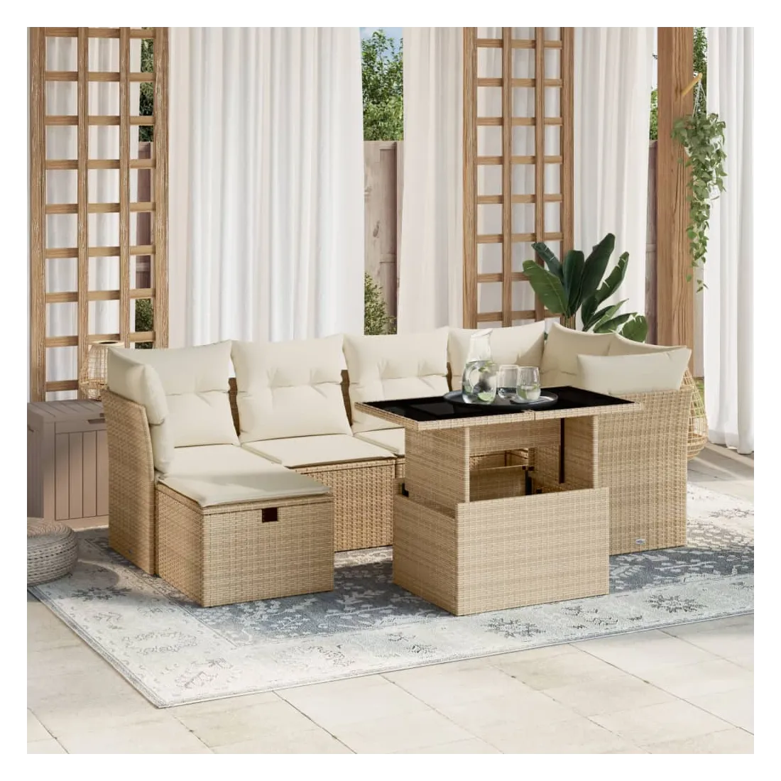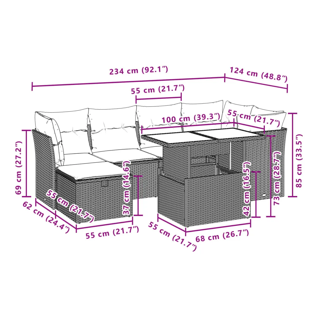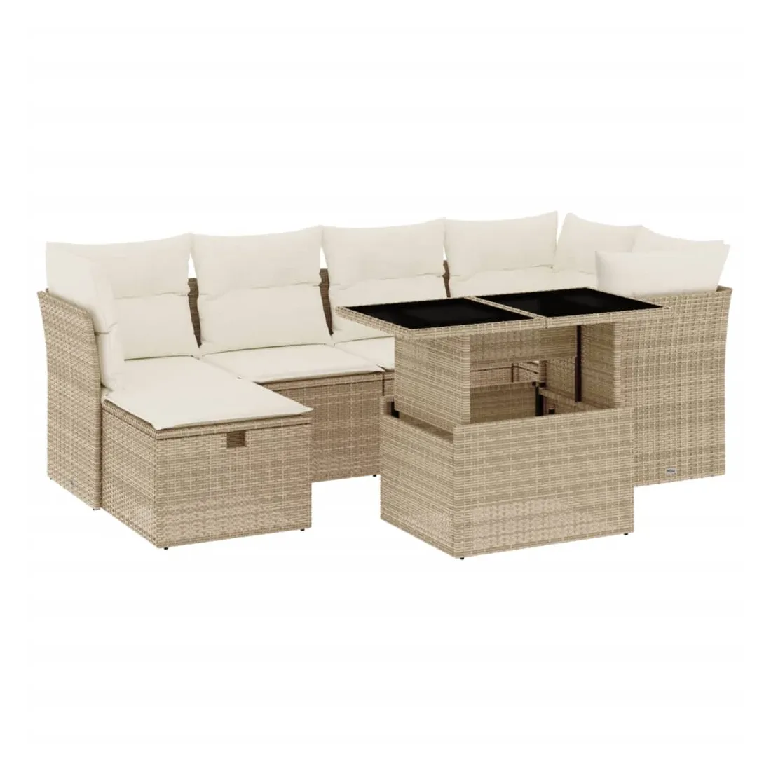 Cet ensemble de canapés de jardin est le complément parfait de votre arrière-cour, terrasse ou patio, offrant un espace confortable et accueillant pour discuter avec la famille et les amis ou simplement se détendre et profiter de l'extérieur. Matériau durable : la résine tressée, également connue sous le nom de poly rotin, est un matériau synthétique solide et nécessitant peu d'entretien qui ressemble au rotin naturel. Il est léger, facile à nettoyer et couramment utilisé pour les meubles d'extérieur en raison de sa durabilité et de ses propriétés de résistance aux intempéries.Dessus de table réglable : le dessus de table peut être soulevé pour rendre la table plus haute, ce qui transforme la table d'extérieur d'une table basse à une table de salle à manger. Elle est parfaite pour recevoir des invités ou prendre des repas à l'extérieur.Housse amovible et lavable : ces coussins de siège sont dotés de housses amovibles pour un lavage et un entretien faciles.Conception modulaire : cet ensemble de meubles d'extérieur a une conception modulaire, ce qui le rend complètement flexible et facile à déplacer, afin que vous puissiez créer un agencement de meubles d'extérieur personnalisé. Bon à savoir :Pour que vos meubles d'extérieur restent beaux, nous vous recommandons de les protéger avec une housse imperméable.