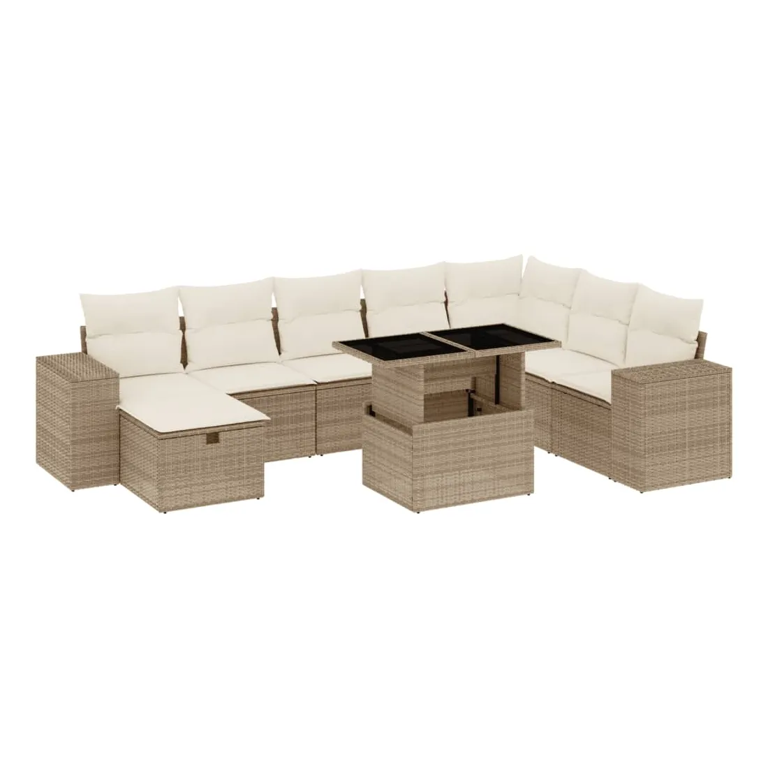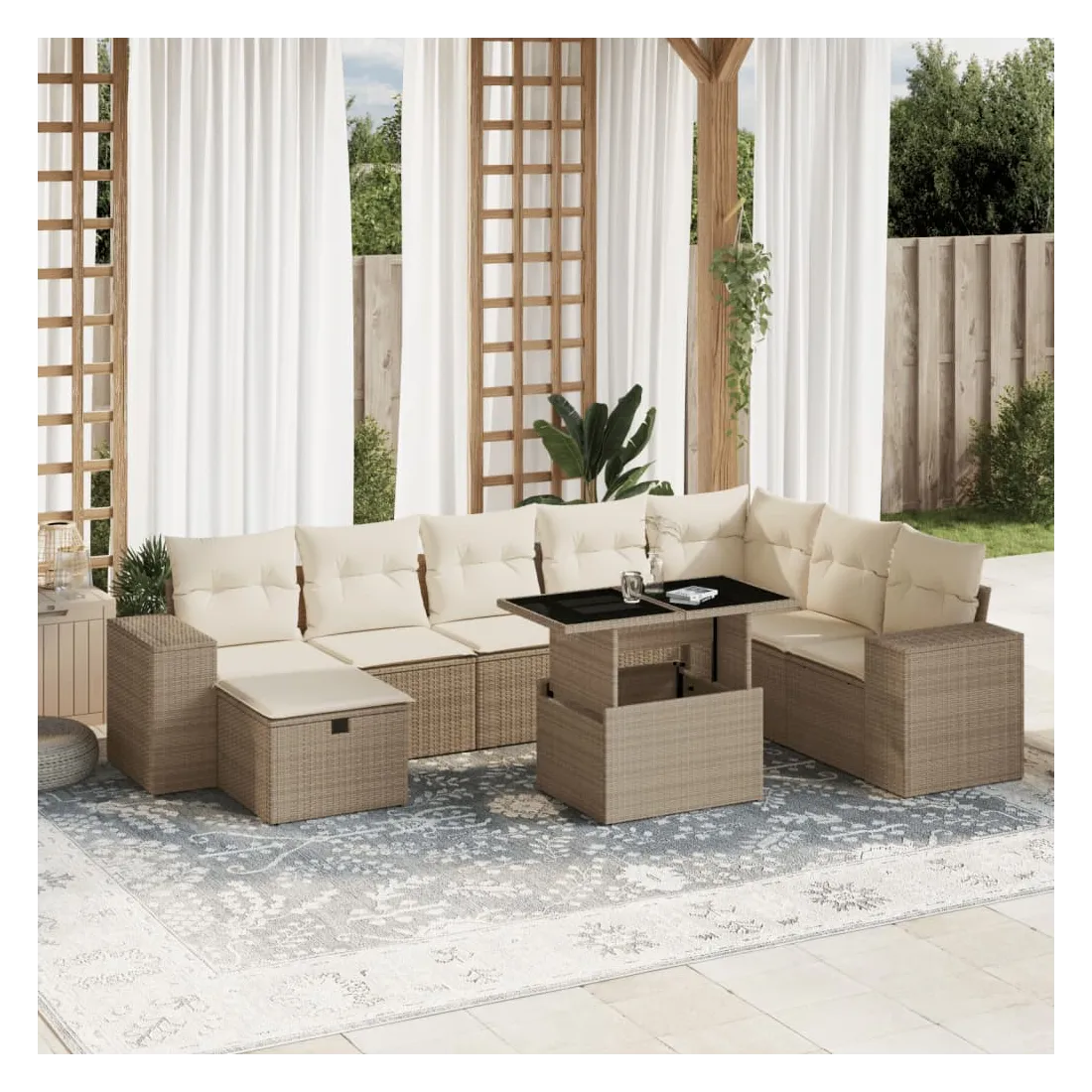 Cet ensemble de canapés de jardin est le complément parfait de votre arrière-cour, terrasse ou patio, offrant un espace confortable et accueillant pour discuter avec la famille et les amis ou simplement se détendre et profiter de l'extérieur. Matériau durable : la résine tressée, également connue sous le nom de poly rotin, est un matériau synthétique solide et nécessitant peu d'entretien qui ressemble au rotin naturel. Il est léger, facile à nettoyer et couramment utilisé pour les meubles d'extérieur en raison de sa durabilité et de ses propriétés de résistance aux intempéries.Dessus de table réglable : le dessus de table peut être soulevé pour rendre la table plus haute, ce qui transforme la table d'extérieur d'une table basse à une table de salle à manger. Elle est parfaite pour recevoir des invités ou prendre des repas à l'extérieur.Dessus en verre : le dessus de la table d'extérieur est fabriqué en verre trempé solide et durable, ce qui le rend facile à nettoyer avec un chiffon humide et ajoute une touche d'élégance à votre espace extérieur.Housse amovible et lavable : ces coussins de siège sont dotés de housses amovibles pour un lavage et un entretien faciles.Conception modulaire : cet ensemble de meubles d'extérieur a une conception modulaire, ce qui le rend complètement flexible et facile à déplacer, afin que vous puissiez créer un agencement de meubles d'extérieur personnalisé. Bon à savoir :Pour que vos meubles d'extérieur restent beaux, nous vous recommandons de les protéger avec une housse imperméable.