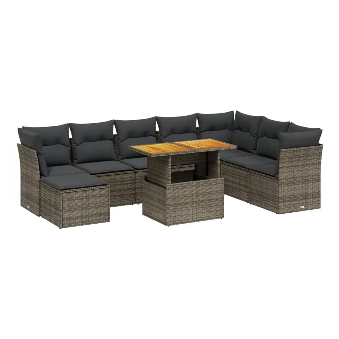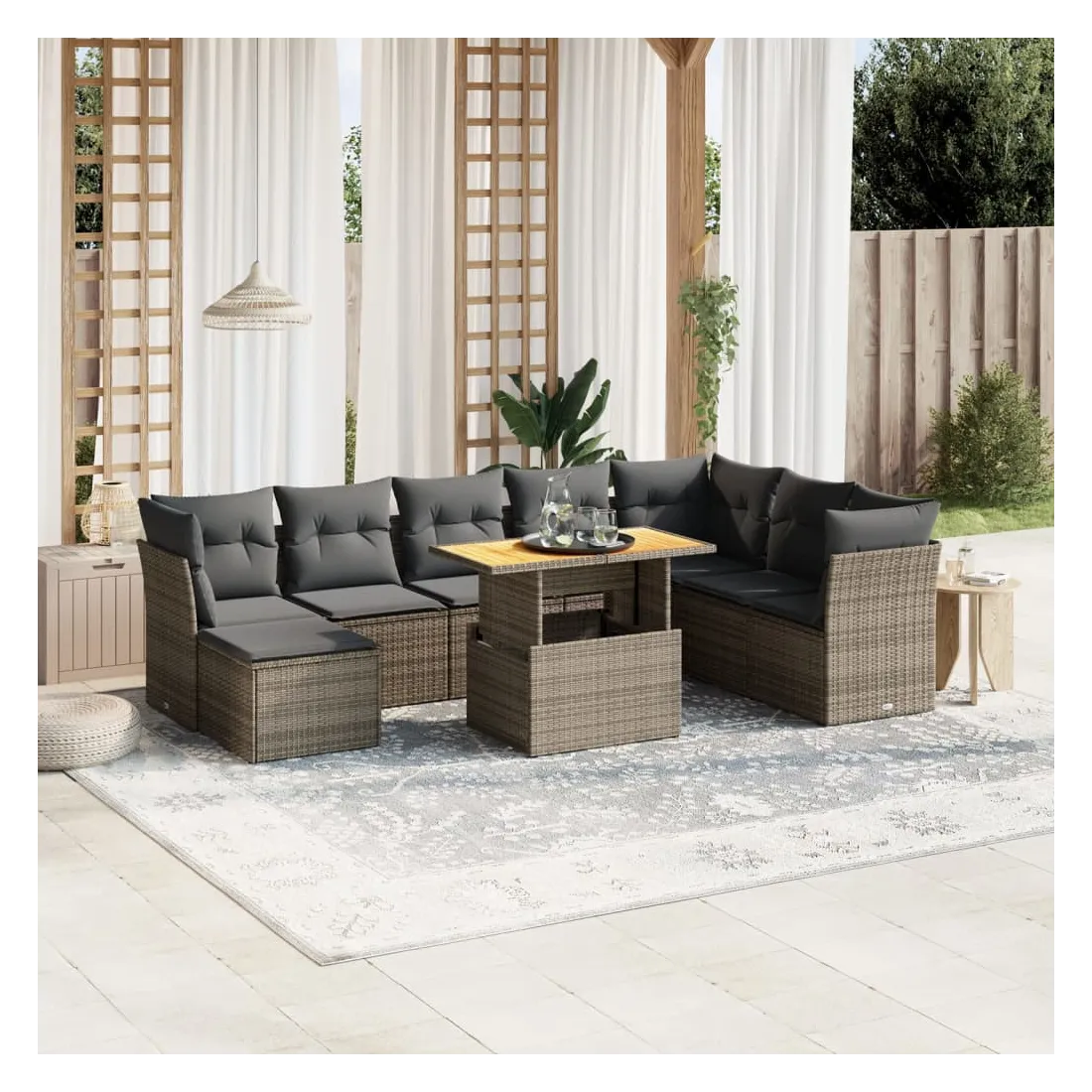 Cet ensemble de canapés de jardin est le complément parfait de votre arrière-cour, terrasse ou patio, offrant un espace confortable et accueillant pour discuter avec la famille et les amis ou simplement se détendre et profiter de l'extérieur. Matériau durable : la résine tressée, également connue sous le nom de poly rotin, est un matériau synthétique solide et nécessitant peu d'entretien qui ressemble au rotin naturel. Il est léger, facile à nettoyer et couramment utilisé pour les meubles d'extérieur en raison de sa durabilité et de ses propriétés de résistance aux intempéries.Dessus de table réglable : le dessus de table peut être soulevé pour rendre la table plus haute, ce qui transforme la table d'extérieur d'une table basse à une table de salle à manger. Elle est parfaite pour recevoir des invités ou prendre des repas à l'extérieur.Housse amovible et lavable : ces coussins de siège sont dotés de housses amovibles pour un lavage et un entretien faciles.Conception modulaire : cet ensemble de meubles d'extérieur a une conception modulaire, ce qui le rend complètement flexible et facile à déplacer, afin que vous puissiez créer un agencement de meubles d'extérieur personnalisé. Bon à savoir :Pour que vos meubles d'extérieur restent beaux, nous vous recommandons de les protéger avec une housse imperméable.