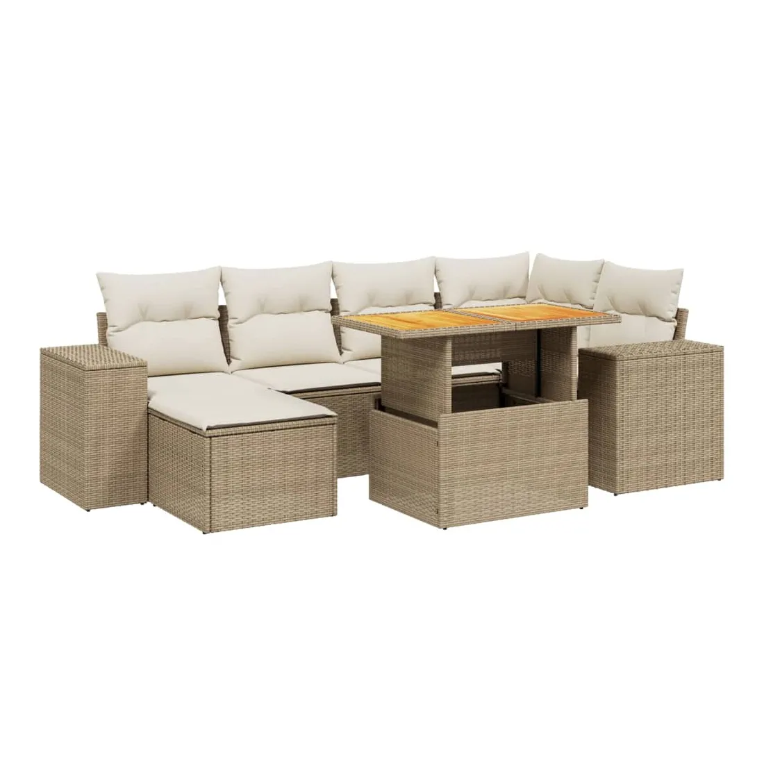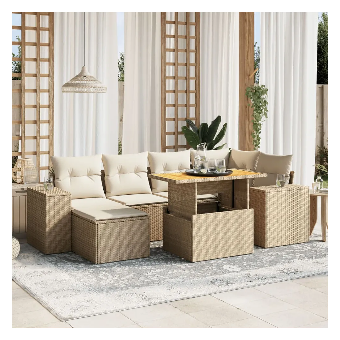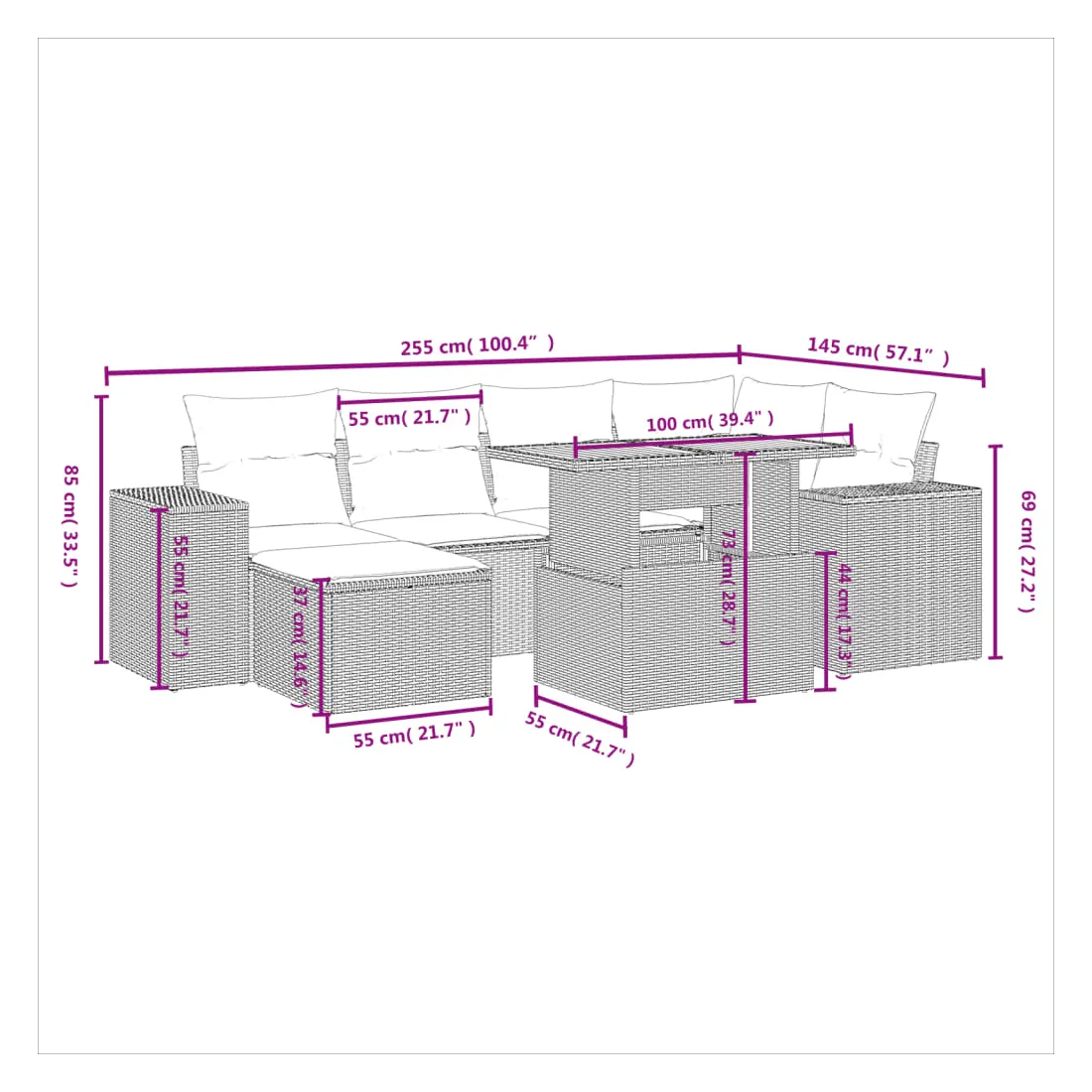 Cet ensemble de canapés de jardin est le complément parfait de votre arrière-cour, terrasse ou patio, offrant un espace confortable et accueillant pour discuter avec la famille et les amis ou simplement se détendre et profiter de l'extérieur. Matériau durable : la résine tressée, également connue sous le nom de poly rotin, est un matériau synthétique solide et nécessitant peu d'entretien qui ressemble au rotin naturel. Il est léger, facile à nettoyer et couramment utilisé pour les meubles d'extérieur en raison de sa durabilité et de ses propriétés de résistance aux intempéries.Dessus de table réglable : le dessus de table peut être soulevé pour rendre la table plus haute, ce qui transforme la table d'extérieur d'une table basse à une table de salle à manger. Elle est parfaite pour recevoir des invités ou prendre des repas à l'extérieur.Housse amovible et lavable : ces coussins de siège sont dotés de housses amovibles pour un lavage et un entretien faciles.Conception modulaire : cet ensemble de meubles d'extérieur a une conception modulaire, ce qui le rend complètement flexible et facile à déplacer, afin que vous puissiez créer un agencement de meubles d'extérieur personnalisé. Bon à savoir :Pour que vos meubles d'extérieur restent beaux, nous vous recommandons de les protéger avec une housse imperméable.