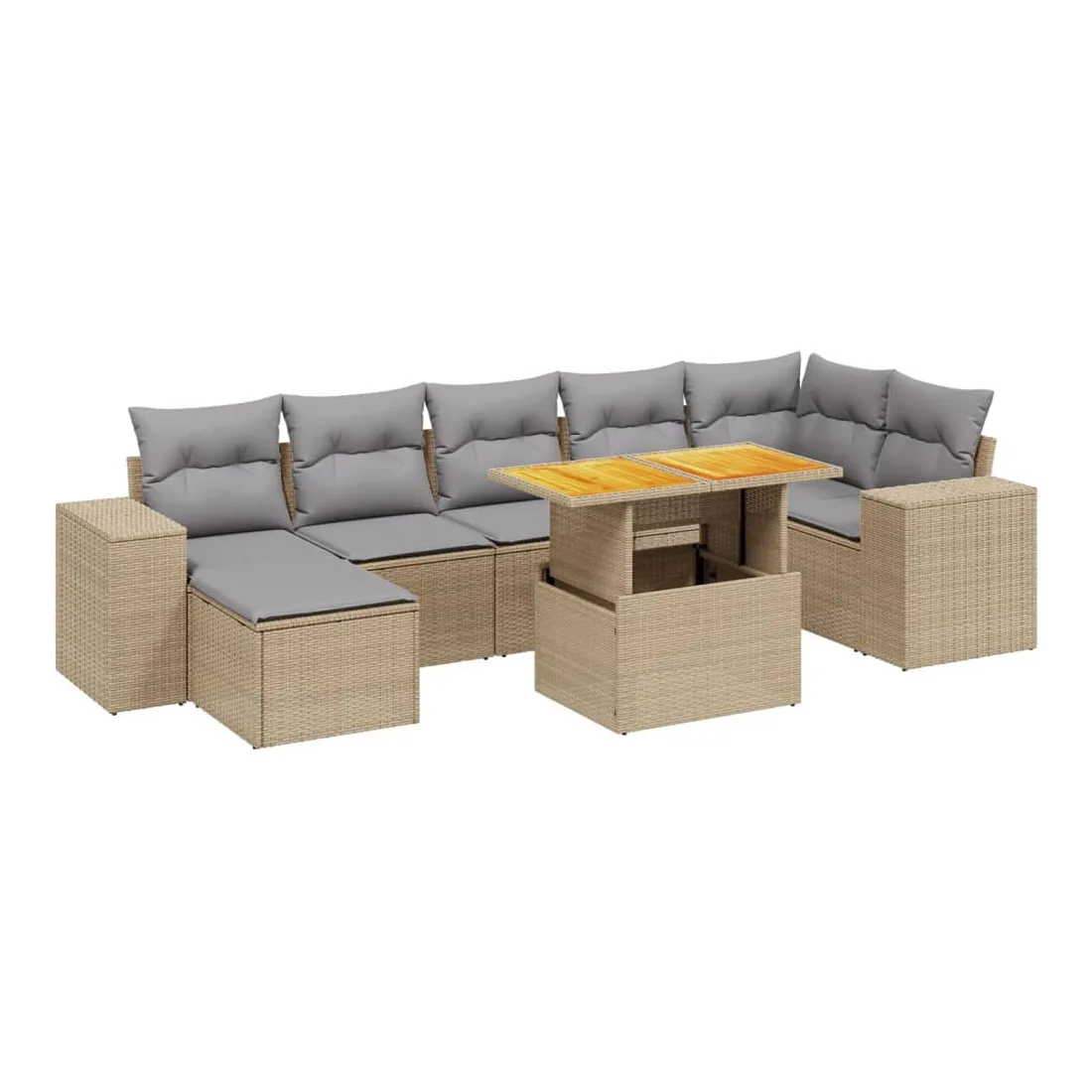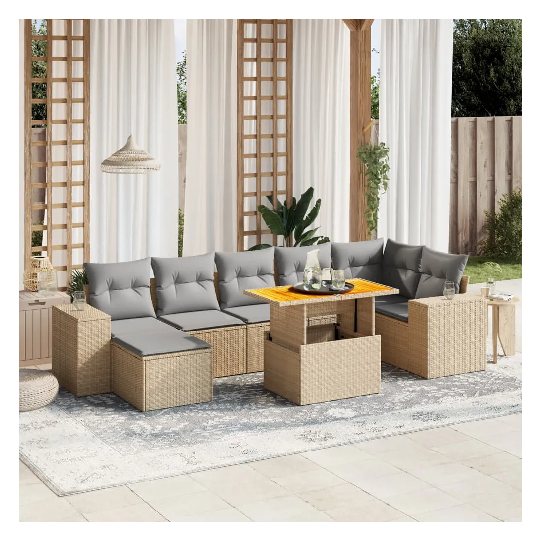 Cet ensemble de canapés de jardin est le complément parfait de votre arrière-cour, terrasse ou patio, offrant un espace confortable et accueillant pour discuter avec la famille et les amis ou simplement se détendre et profiter de l'extérieur. Matériau durable : la résine tressée, également connue sous le nom de poly rotin, est un matériau synthétique solide et nécessitant peu d'entretien qui ressemble au rotin naturel. Il est léger, facile à nettoyer et couramment utilisé pour les meubles d'extérieur en raison de sa durabilité et de ses propriétés de résistance aux intempéries.Dessus de table réglable : le dessus de table peut être soulevé pour rendre la table plus haute, ce qui transforme la table d'extérieur d'une table basse à une table de salle à manger. Elle est parfaite pour recevoir des invités ou prendre des repas à l'extérieur.Housse amovible et lavable : ces coussins de siège sont dotés de housses amovibles pour un lavage et un entretien faciles.Conception modulaire : cet ensemble de meubles d'extérieur a une conception modulaire, ce qui le rend complètement flexible et facile à déplacer, afin que vous puissiez créer un agencement de meubles d'extérieur personnalisé. Bon à savoir :Pour que vos meubles d'extérieur restent beaux, nous vous recommandons de les protéger avec une housse imperméable.