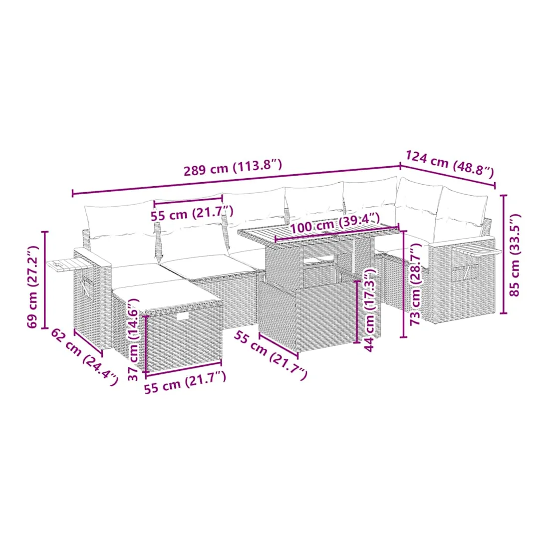 Cet ensemble de canapés de jardin est le complément parfait de votre arrière-cour, terrasse ou patio, offrant un espace confortable et accueillant pour discuter avec la famille et les amis ou simplement se détendre et profiter de l'extérieur. Matériau durable : la résine tressée, également connue sous le nom de poly rotin, est un matériau synthétique solide et nécessitant peu d'entretien qui ressemble au rotin naturel. Il est léger, facile à nettoyer et couramment utilisé pour les meubles d'extérieur en raison de sa durabilité et de ses propriétés de résistance aux intempéries.Dessus de table réglable : le dessus de table peut être soulevé pour rendre la table plus haute, ce qui transforme la table d'extérieur d'une table basse à une table de salle à manger. Elle est parfaite pour recevoir des invités ou prendre des repas à l'extérieur.Table d'appoint pratique : ce mobilier d'extérieur comprend une table d'appoint pliable avec un ressort à gaz sur les accoudoirs, offrant un endroit pratique pour garder vos essentiels à portée de main.Housse amovible et lavable : ces coussins de siège sont dotés de housses amovibles pour un lavage et un entretien faciles.Conception modulaire : cet ensemble de meubles d'extérieur a une conception modulaire, ce qui le rend complètement flexible et facile à déplacer, afin que vous puissiez créer un agencement de meubles d'extérieur personnalisé. Bon à savoir :Pour que vos meubles d'extérieur restent beaux, nous vous recommandons de les protéger avec une housse imperméable.