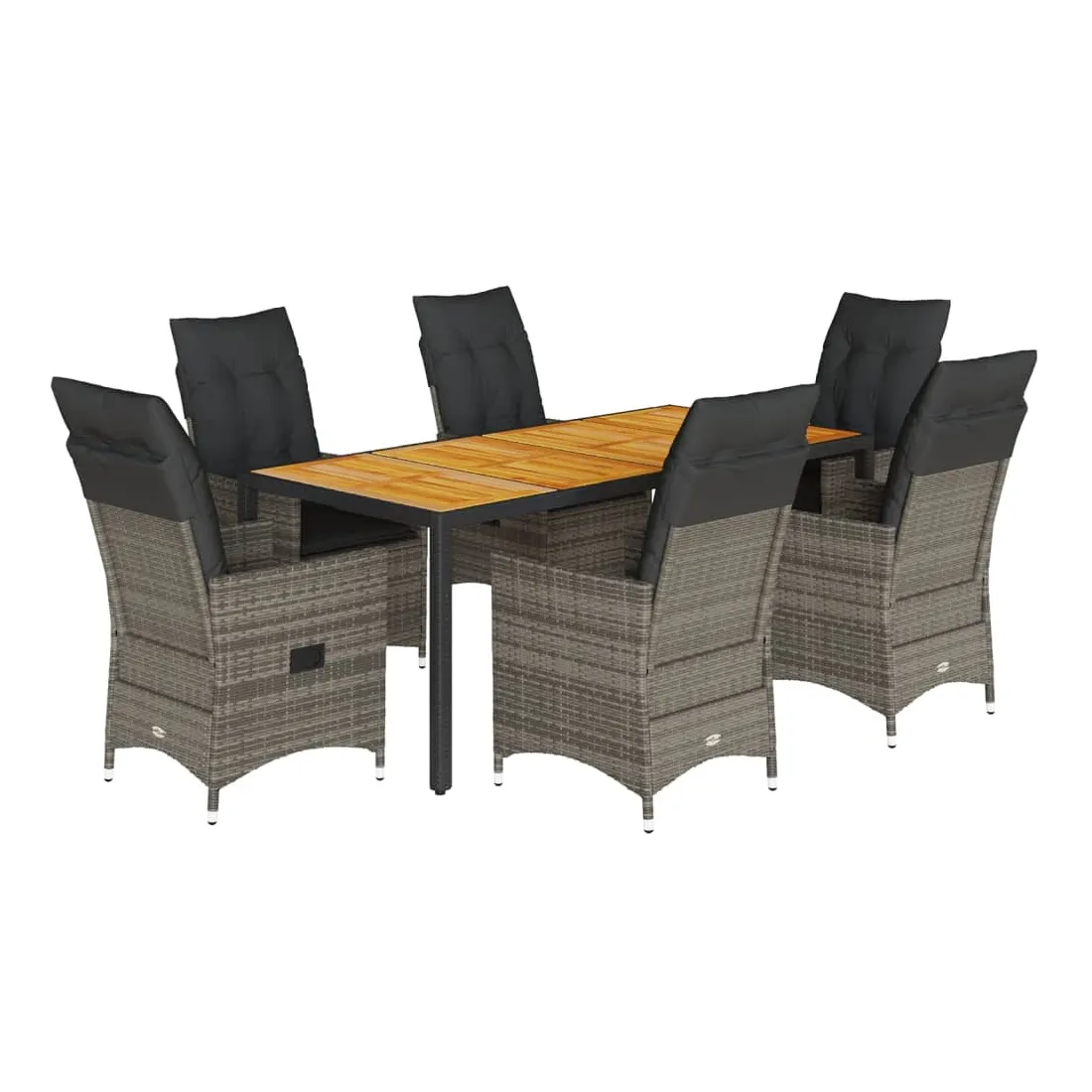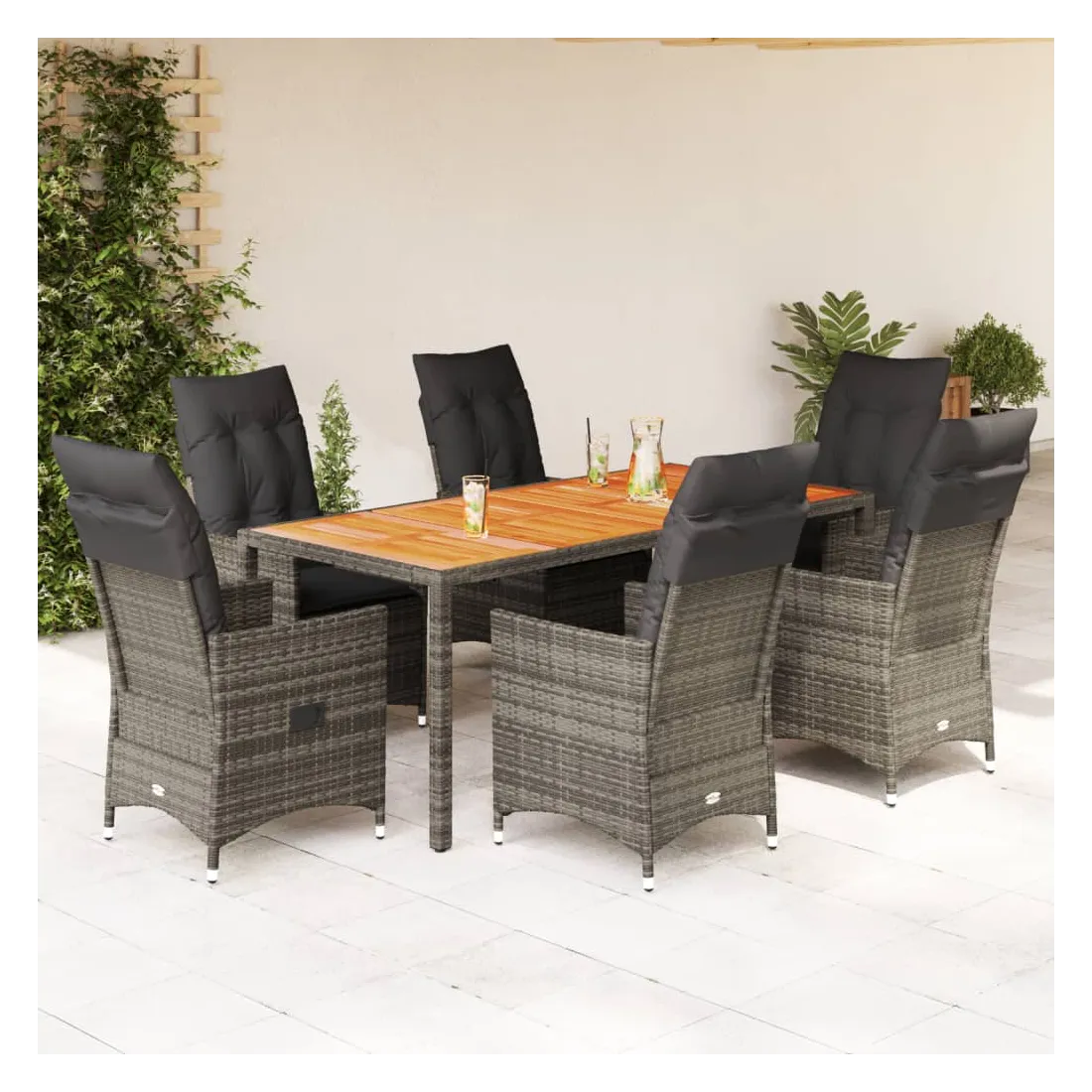 Cet ensemble de salle à manger de jardin est un excellent choix pour les repas en plein air ou pour vous détendre dans le jardin, dans l'arrière-cour ou sur la terrasse. Matériau durable : la résine tressée, également connue sous le nom de poly rotin, est un matériau synthétique solide et nécessitant peu d'entretien qui ressemble au rotin naturel. Il est léger, facile à nettoyer et couramment utilisé pour les meubles d'extérieur en raison de sa durabilité et de ses propriétés de résistance aux intempéries.Dossier réglable : ce siège de jardin est doté d'une poignée. Vous pouvez régler le dossier dans n'importe quelle position en tirant sur la poignée et le remettre rapidement dans sa position initiale.Dessus stable et facile à nettoyer : cette table de jardin a un dessus en bois d'acacia robuste, durable et facile à nettoyer avec un chiffon humide.Expérience d'assise confortable : cet ensemble de meubles d'extérieur, doté de coussins épais, offre une expérience d'assise confortable.Housse amovible et lavable : ces coussins de siège sont dotés de housses amovibles pour un lavage et un entretien faciles. Les coussins de dossier ont un rabat à l'arrière pour une fixation facile aux dossiers. Bon à savoir :Pour que vos meubles d'extérieur restent beaux, nous vous recommandons de les protéger avec une housse imperméable.