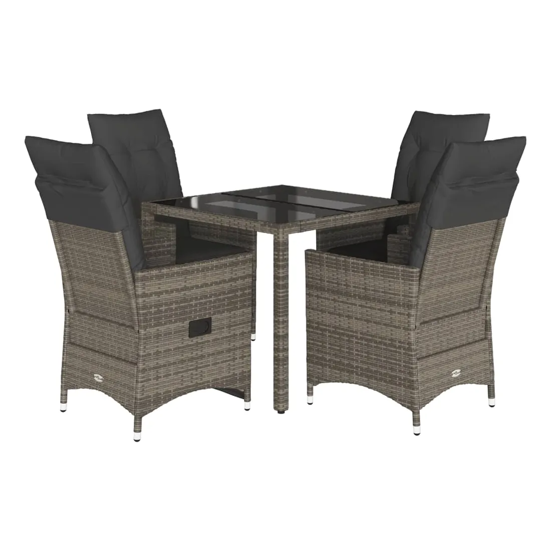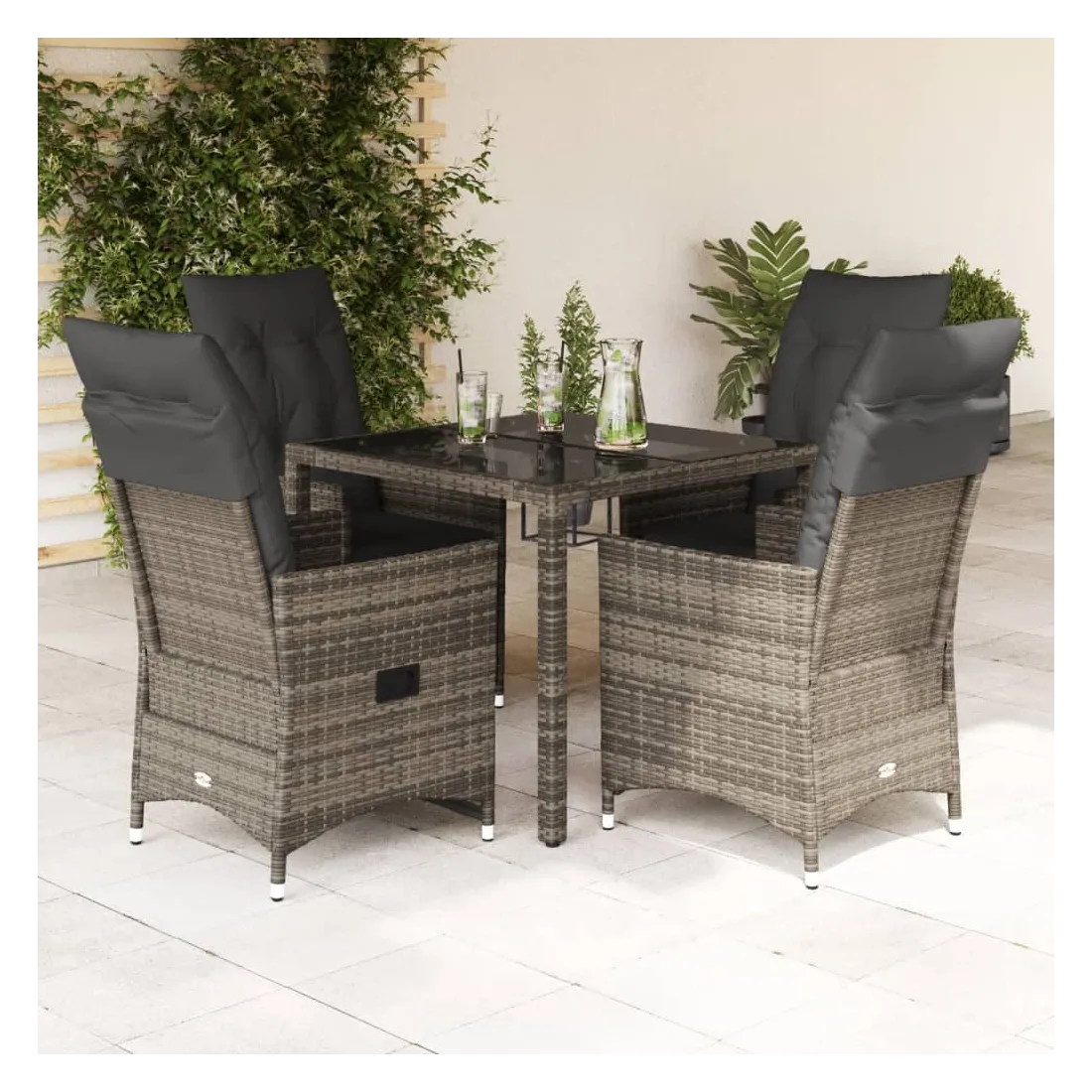 Cet ensemble de salle à manger de jardin est un excellent choix pour les repas en plein air ou simplement pour se détendre dans le jardin, la cour arrière ou sur la terrasse. Matériau durable : le rotin PE, également appelé polyrotin, est un matériau synthétique solide et facile d'entretien qui ressemble au rotin naturel. Il est léger, facile à nettoyer et couramment utilisé pour les meubles d'extérieur en raison de sa durabilité et de sa résistance aux intempéries. Dossier réglable : ce siège de jardin est équipé d'une poignée. Vous pouvez régler le dossier dans n'importe quelle position en tirant sur la poignée, puis le remettre rapidement dans sa position d'origine. Plateau en verre : le plateau de la table d'extérieur est en verre trempé solide et durable, ce qui le rend facile à nettoyer avec un chiffon humide et ajoute une touche d'élégance à votre espace extérieur. Assise confortable : cet ensemble de mobilier d'extérieur, doté de coussins épais et rembourrés, offre une assise confortable. Housse amovible et lavable : ces coussins d'assise sont dotés de housses amovibles pour faciliter le lavage et l'entretien. Les coussins de dossier sont munis d'un rabat à l'arrière pour faciliter leur fixation aux dossiers. Bon à savoir :Pour que votre mobilier d'extérieur reste beau, nous vous recommandons de le protéger avec une housse imperméable.